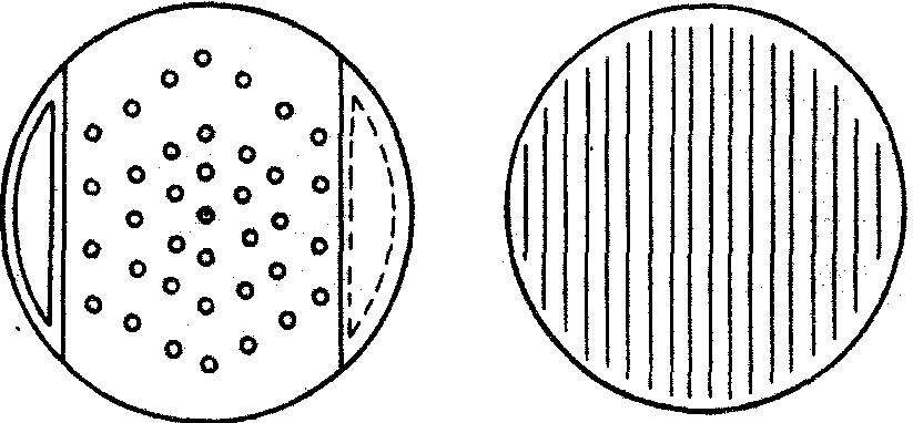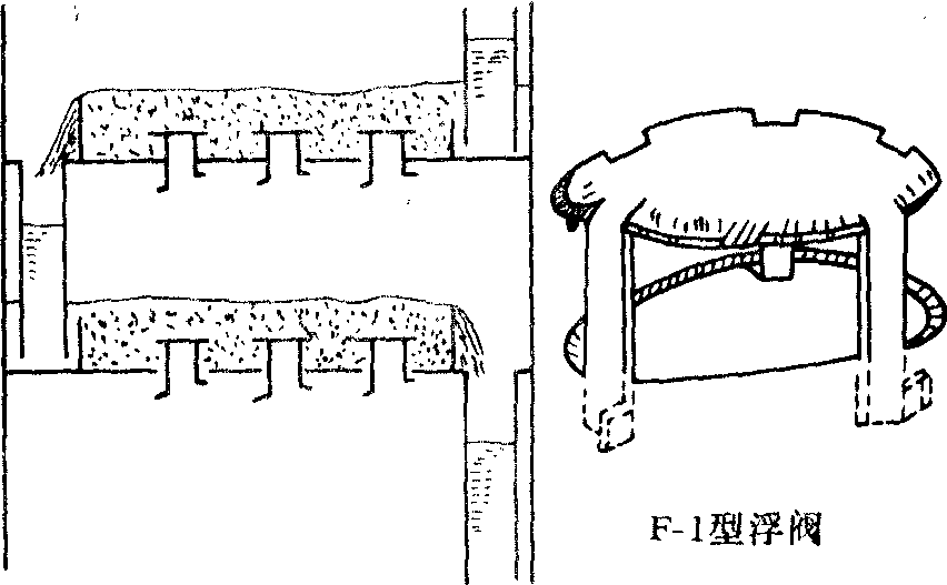图2 泡 罩 塔 浮阀塔以浮阀作为气体分布元件。浮阀具有各种型号,主要是由 一个可以上下浮动的浮阀置于塔板上的阀孔之上所构成。图3所示的为目前国内常用的F—1型浮阀,它由圆盘形阀片和3条支脚组成,气体由下而上通过圆形阀孔,经浮阀分散于塔板上液层之中。随着气体流量变化,依靠浮阀上下浮动来改变气体通道截面积的大小,以保证气体通过液层具有稳定良好的接触状态。浮阀塔较泡罩塔具有生产能力大,造价低,在较大的气体流量变化范围内能保持较高的效率之优点。近年来,浮阀塔的应用日益广泛。