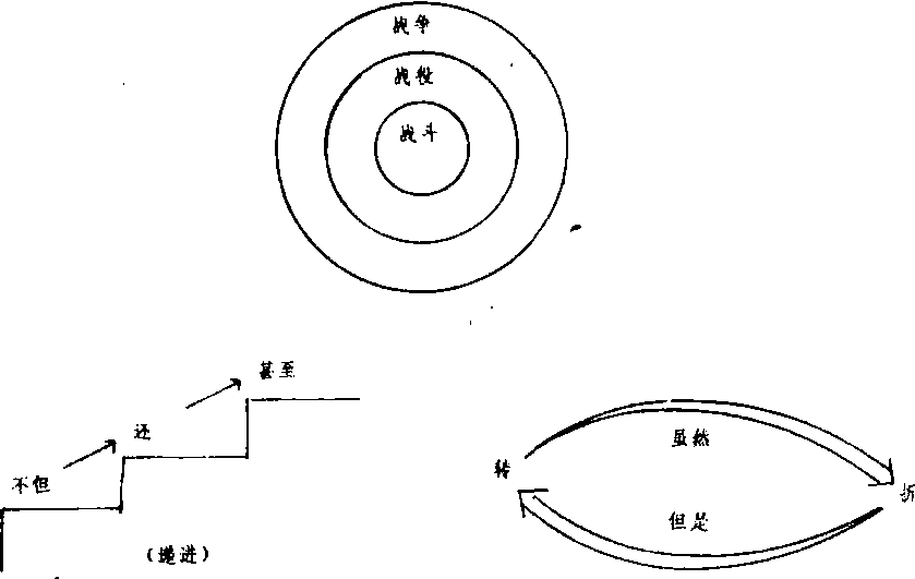 | 释义 | 板画示意法Banhua shiyifa词语教学的方法之一,是教师采用简笔画的形式,以示意性的符号、具体形象的图形帮助学生理解抽象意义的一种方法。譬如词义的范围大小讲解时较难说清楚,像“战役”、“战争”、“战斗”,可以用图1示意,学生便能容易理解。又如关联词语也不好理解,比较抽象,学生掌握有困难。教师在叙述课文中的例句时, 可相应在黑板上画出示意图形,如图2和图3演出递进关系和转折关系。板画示意是一种形象的释义形式,教师应根据教学需要,选择有图可画, 而无图学生理解起来又较为困难的词语进行板画示意。能用语言表述清楚的词语,就不要非用此种方法, 而对于较难形成图意之间有机联系的词语更不能牵强构图,否则反而增加学习的困难。教师要具有一定的板画能力,设计的板画要求图形既简单,示意又明确。