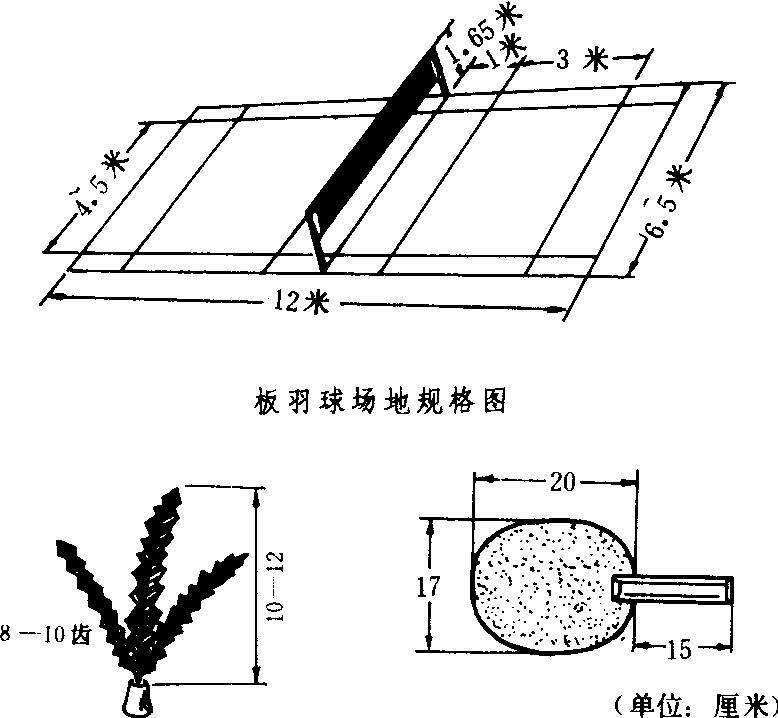 板羽球和板羽球拍(单位:厘米) 板羽球运动Banyuqiu yundong运动员各在网的一方互相用木制板羽球拍往返击打以橡胶托插有3根多齿羽毛制成的板羽球, 使球落在对方场地上或使对方击球失误而得分的小型球类运动。板羽球是在中国抗日战争时期物质条件困难的环境中发展起来的一种群众性体育活动项目。1939年,在贵州由当时中华全国体育协进会见到苗族青年以小竹管插鸡毛, 用木板打击进行活动而受到启发,设计了球拍和羽球,并制定了规则,命名为“板羽球”。当时在成都、重庆、昆明等地学校和体育运动场所先后开展起来。中华人民共和国成立以后,它被推广全国各地,板羽球比赛方法与羽毛球相似,场地、器材简单,技术、打法易学,是易于普及作为学校课外活动的一项运动。 板羽球运动球类运动项目之一,属群体项目。场地长12m,单打宽4.5m,网柱高1.65m,双打场地宽6.5m,网中央高1.5m,距中线1m为前发球线,4m为后发球线,中间区域为发球区。比赛分单、双打。双方持长35cm、拍面宽7cm、厚1cm木质球拍隔网相互击打羽球,羽球由橡胶底座和3根塑制羽毛(羽长10~12cm,球重4~6g)组成。每方只能一次将球击打过网,未击中球使球落地或未能一次将球击过网,对方即得分,每场比赛采用3局2胜制,前2局每局21分,打成1∶1后,第3局采用15分制,每球得分,每局须净胜2球以上。 |