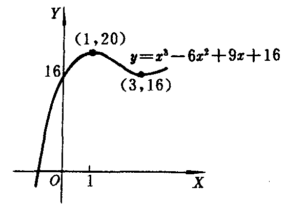 图1 例如,函数f(x)=x3-6x2+9x+16,在(-∞,1)内是单调增的,在(1,3)内是单调减的,在(3,+∞)内又是单调增的.而在邻域(1-δ,1+δ),恒有f(x)≤f(1);在邻域(3-δ,3+δ),恒有f(x)≥f(3).所以f(1)=20为f(x)的极大值,点1为极大值点;而f(3)=16为f(x)的极小值,点3为极小值点.从f(x)=x3-6x2+9x+16的图象上,可以直观地看到它在(-∞,1)内上升,在(1,3)内下降,在(3,+∞)内上升,而点(1,20)是曲线上一个高峰,点(3,16)是曲线上一个低谷(如图1).实际上它们分别反映出函数的极大值和极小值. 函数的极值只是在一点的邻域这样一个很小范围内的最大值和最小值,所以它是局部性的.一个定义在区间〔a.b〕上的函数可以有许多个极大值和极小值,并且其中极大值不一定都大于每一个极小值(如图2).