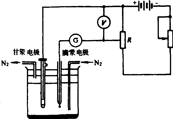 图1 Pb2+极谱图 仪器 为极谱仪。它由电压、电流控制单元、测量和记录单元及电解池(包括滴汞电极和参比电极)三个部分组成。例如直流极谱法装置(图2),将滴汞电极和参比电极(通常为甘汞电极)放入盛有待测液的电解池中。在电解前先通N2以除去电解液中的溶解氧。在电解液保持静止的条件下,逐步改变两电极上的电压进行电解,记录电流—电压值,或由记录仪直接绘出电流—电压曲线。