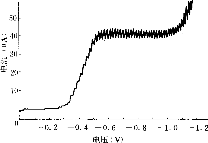 分析过程 将被测定物质配制成浓度为10-2~10-5摩尔/升的溶液,加入适量的支持电解质(如KCl等)及极大抑制剂(如动物胶等),再调节合适pH值,用氮气通过溶液约10分钟,除去溶解的氧气,然后使汞滴以每10秒2~3滴的速度滴下,转动接触键,使两极的外加电压自零逐渐增加,记下各不同电压时的电流值,以电压为横坐标,电流为纵坐标,绘制电压—电流曲线。图2为甲基对硫磷的极谱图。当滴汞