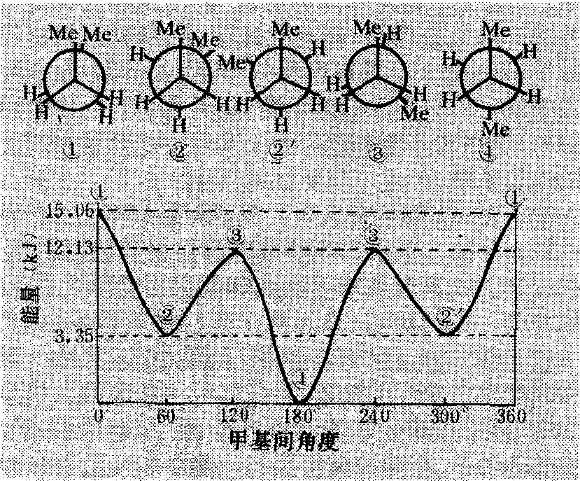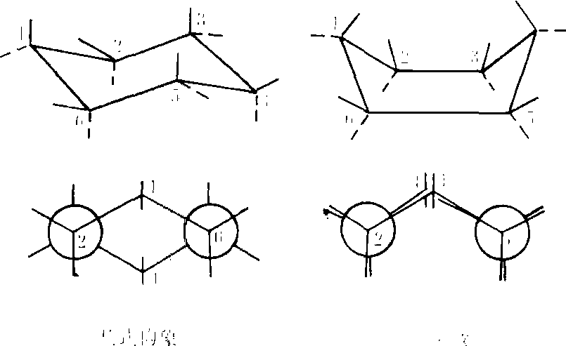 图1 丁烷的各种构象及其能量 ❷环己烷及其杂环的同型化合物,主要有椅式和船式两种构象。椅式构象具有最多的交叉组合,因为这样非键合原子或原子团之间的相互排斥作用最小,而成为优势构象;船式构象由于原子或原子团之间的相互排斥作用较大,不稳定(图2)。杀虫剂六六六中的有