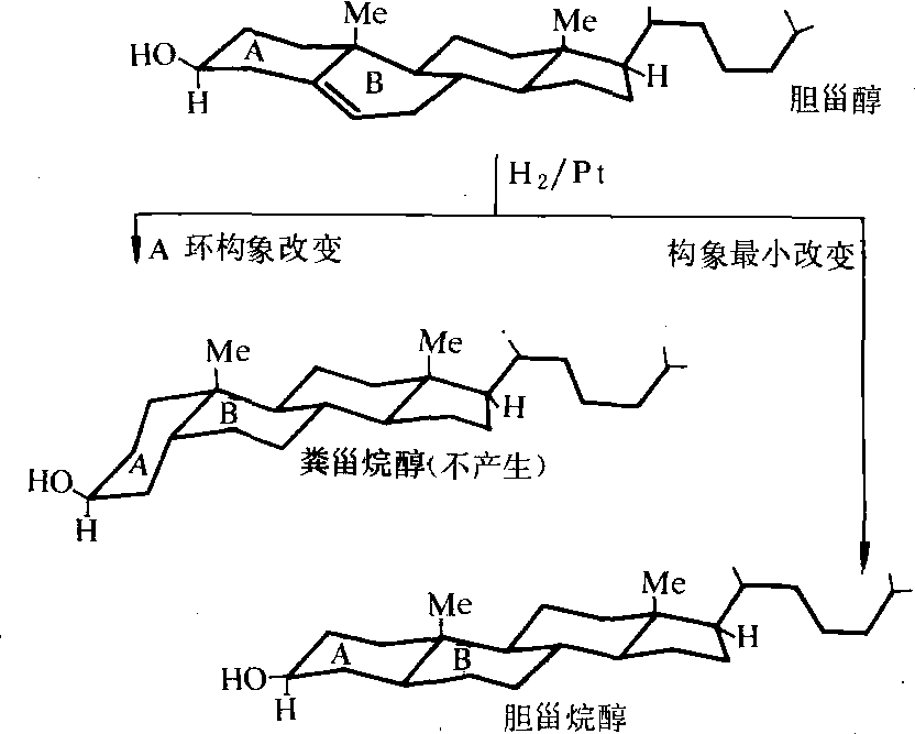 图2 环己烷的椅式、船式构象 效体γ-体,则是16个构象异构体中的一个,含量为14%,经特殊处理分离提纯,才能得到纯γ-六六六体,叫林丹。虽然一个分子的某一构象比其他可能的构象稳定,但并不意味着这个分子就以这种构象参加反应,或这个分子就固定于此构象形式。构象最小改变原理 使初生成产物的构象与反应物的构象改变最小的规则。在有机反应中,由于构象的选择和反应过渡态的几何形象所需条件之间的相互制约,决定了产物分子的本质。参与反应的中心须处于同一直线或同一平面上,或者具有相似的立体化学和电子关系。进入反应的反应物分子,其相互间的向位应最少偏离反应机制的要求,也应使初生成产物的构象较反应物原来的构象改变最小。以构象和构象分析为基础的动态立体化学,阐明了反应的主要方向,成为不对称合成的理论基础。例如胆甾醇的催化氢化反应产物,只产生构象最小改变的胆甾烷醇,而不能得到粪甾烷醇(图3)。