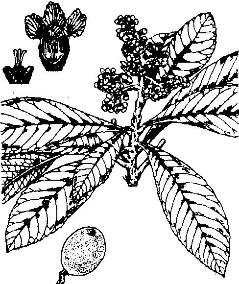 枇杷loquatEriotrya japonica Lindl.,蔷薇科,枇杷属。常绿小乔木。栽培品种均属普通枇杷。原产中国。其原生种分布于湖北西部、四川东部;栽培品种分布于长江中下游及以南各地。树高6~10 m。树干灰褐色,粗糙。新梢密被茸毛。叶近于无柄,倒卵形或长椭圆形,叶缘有锯齿缺刻,叶背密被锈色茸毛。花多数复总状花序,秋冬开花;萼片宿存;雄蕊多数;子房下位,通常5室,每室有2个胚珠,一般2~6个发育成种子。果皮橙红或淡黄色。夏初成熟。2n=32,34。果实可供鲜食,并可制糖水罐头、果膏和果子露食品。果和叶子可入药。花为蜜源。也为优良绿化观赏树种。