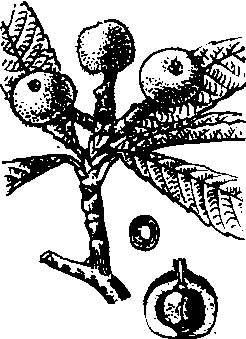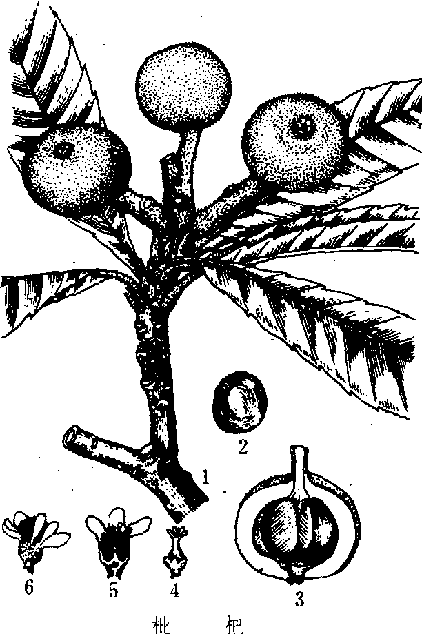 1. 果枝; 2. 种子; 3. 果实纵剖面; 4. 雌蕊5. 花纵剖面; 6. 花 枇杷生长发育要求较高温度, 一般年均温12℃以上即能生长, 15℃以上更适, 冬季及初春的低温对开花及幼果发育影响极大,低温应不低于-3℃。要求年降水量1 000~2 000毫米。因叶大怕风, 沿海多台风地区宜选避风处种植并造防护林。对土壤适应性广,以土层深厚、土质疏松、不易积水为佳, pH5~6.5均可栽培。 主要品种 枇杷品种很多, 按果肉色泽可分为红肉(红沙)类及白肉(白沙)类,前者肉色橙红或橙黄,后者肉白色, 尚有红白杂交而近于白色者。一般红肉类生长强健, 易栽培, 产量高, 果皮厚, 肉质较粗, 耐贮运, 适于制罐; 白肉类生长较弱, 栽培较难, 较低产, 果皮薄, 成熟期多雨易裂果, 肉质细、品质好,适于鲜食。 红肉类 优良品种有: ❶大红袍。产浙江余杭塘栖。果圆形, 重约37克, 果皮浓橙红色, 果粉厚, 茸毛长, 皮韧而厚, 易剥。果肉厚, 橙黄色,甜多酸少,肉质致密,较粗,汁液中等。当地6月上中旬成熟。 ❷夹脚。产浙江余杭塘栖。果椭圆或卵形, 多歪斜, 重约33克, 果皮麦秆黄色, 厚而强韧, 茸毛长且密。果肉厚, 淡橙黄色, 质粗, 甜少酸多味浓。当地6月上中旬成熟。 ❸大钟。福建莆田的主栽品种。果倒卵圆形, 基部尖削, 重约50克。果肉厚, 橙黄色, 质地中等致密, 甜而微酸, 味较浓, 品质中上。当地5月上旬成熟。 ❹解放钟。大钟实生选种后代。果大, 重约61克, 倒卵形至长倒卵形, 果皮橙红色, 中等厚, 易剥皮。果肉厚, 橙黄色, 肉质细密, 甜酸适度, 风味浓,5月上中旬成熟。 ❺富阳。江苏吴县主要品种。果圆球形, 重约30克, 果皮橙红色, 茸毛甚多, 皮薄易剥。果肉橙红色, 致密细腻, 汁多味甜但较淡。 ❻光荣。安徽歙县主要品种。果短卵形, 重约45克, 果皮橙黄色。果肉厚, 橙黄色, 质粗, 甜而微酸,多汁、品质中上。5月下旬成熟。 白肉类 优良品种有: ❶软枝白砂。产浙江余杭塘栖。果倒卵形、圆形, 重约25克, 果皮淡黄色, 极薄,易剥。果肉黄白色或乳白色,品质极佳。当地6月上旬成熟。 ❷照种。江苏吴县栽培最多的品种。果圆形或略扁, 重约30克, 果皮淡橙黄色, 果粉厚, 皮薄易剥。果肉黄白色, 汁多, 质地细腻, 糖多酸少, 品质极佳。当地6月中旬成熟。 ❸白梨。福建莆田主栽品种。树冠半开张, 枝条分枝多。果实圆形,果顶平,基部钝圆, 重约30克。果皮淡黄色, 果粉多, 皮薄易剥。果肉乳白色, 质地细腻, 汁多、甜而带清香, 味浓。 栽培技术要点 常用嫁接法育苗, 切接、腹接、劈接、嵌接均可。用共砧。种子洗净阴干即播, 宜浅播,播后不盖土, 用木棍滚压种子入上, 再盖稻草。幼苗喜阴, 搭荫棚或间作物遮荫。5月播种,9月疏苗移栽,苗高70厘米以上可嫁接,以春梢萌动前后为最适期。秋植或春植, 株行距3×4米。果实需钾最多, 氮、磷次之, 成年树每公顷施氮、钾各195~225千克,磷150~195千克, 分3~4次施用, 着重采果后夏梢抽生期、开花前及幼果迅速增大期施肥。果成熟期雨水过多易引起严重落果,要注意排水; 日照强烈又易焦灼果实,可中午喷水; 夏秋干旱花穗变小,注意灌水或树盘覆盖。整形多用变侧主干形, 修剪主要疏除过密枝、枯枝和徒长枝。为调节叶果比, 提高果实品质,须疏花疏果。易裂果的品种宜于果皮转淡绿时套袋。主要病虫害有枇杷烂脚病,为害主干及侧枝,炭疽病, 为害果实; 黄毛虫、天牛、木蠹蛾、蛴螬等, 分别为害叶片、枝干及根。除冬季清园, 加强管理, 增强树势外, 对烂脚病刮除病斑和涂波尔多浆或1:4纯碱水,对炭疽病可在谢花后幼果期喷1 000倍50%托布津液或1 000倍50%瑞毒霉液,对黄毛虫等虫害分别用相应杀虫剂喷杀、灌注或淋杀。 经济价值 枇杷果实成熟于春末夏初, 正是水果淡季, 果肉柔软多汁, 甜酸适度, 风味佳良, 在市场上很受欢迎。果实除鲜食外, 可制罐头、酿酒、制果膏、果露等, 有润肺、止咳、健胃和清热的功效。叶用作镇咳剂和利尿剂。树冠整齐美丽, 周年常绿, 冬花春实, 是优良的庭园绿化观赏树和冬季蜜源植物。 枇杷loquatEriobotrya japonica,蔷薇科枇杷属常绿乔木。染色体数2n=2x=34。小枝粗壮,密被锈色绒毛;单叶互生,革质,椭圆状长圆形、倒卵形或披针状卵圆形,长12~30cm,先端急尖或渐尖,基部楔形,叶缘中上部具疏齿,叶面皱、叶背具灰棕色绒毛;圆锥花序顶生,花白色、具芳香,花期10~12月;梨果肉质、近球形,径约2~4cm,5~6月成熟时橙黄色。产中国陕西、甘肃、河南、安徽、江苏、浙江、福建、台湾、江西、湖南、湖北、云南、贵州、四川、广东、广西等地,湖北、四川仍有野生;日本、印度、越南、缅甸、泰国、印度尼西亚等也有栽培。喜光,稍耐阴;喜温暖湿润气候,不耐寒;适生于肥沃而排水良好的中性至酸性土壤。通常用种子繁殖,优良品种用嫁接繁殖。生长慢,寿命长,移植宜带土球。一般实生苗4~5年生开始结果。主要的病虫害有枇杷黄毛虫、举尾虫、枇杷天牛、枝干腐烂病、炭疽病等。枇杷树姿优美,花、果、叶均可供观赏,是园林绿地中习见栽培的观赏树种。