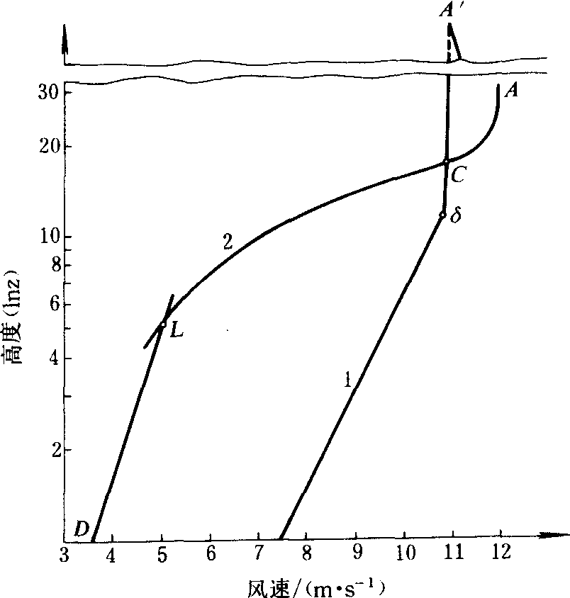 单条林带附近的风向不再是水平的,向风面有强的上升气流,背风面有较强的下沉气流。风廓线与旷野相比有明显的不同。风洞实验结果如图所示。图中δ为边界层厚度,边界层内风速的垂直分布满足对数分布规律;在接地面的一薄层内(DL段)由于地面的摩擦作用,风速随高度的分布保持对数(或指数)分布规律,但速度较旷野同一高度的风速小,该层称为下边界层或内边界层; LC段较旷野风速小,称为弱风区,C点的相对风速达到100%; CAA′风速大于100%,被称为增速区,A′为林带影响所及的高度,更上为不受林带影响的区域。单条林带背风面风速削弱的程度和林带结构、气象条件、地面因素三方面有关。