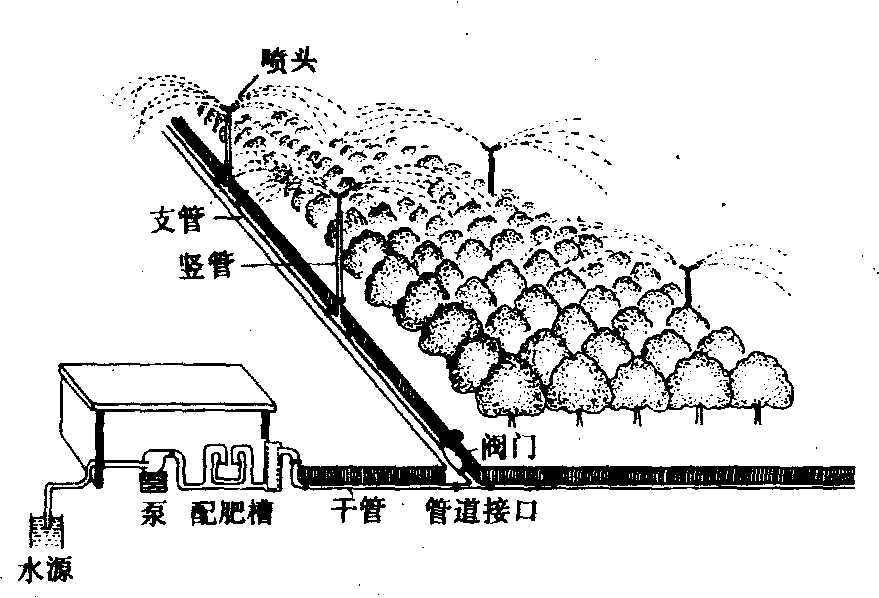 果园喷灌系统 由水源、进水管、水泵站、输水管道、竖管、喷头(或喷嘴)等组成(见图)。整个喷灌系统分固定式、半固定式、移动式3种类型。水泵从水源取水并加压, 经由压力输水管道系统(由干管、支管、竖管以及管道附近等组成)送到果园, 由喷头将水喷射到空中, 散成细小水滴, 像降雨一样均匀洒布在灌溉地段上。按喷头的结构形式与水流的形状, 又可分为旋转式、固定式和孔管式3种。