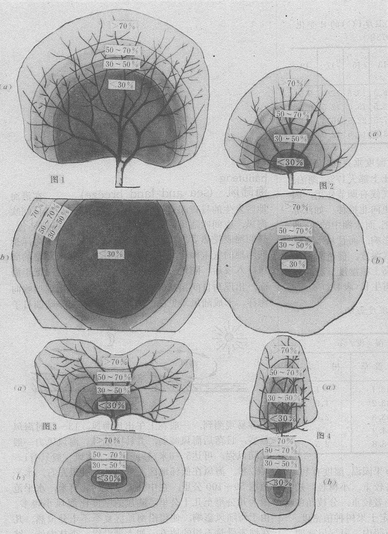 苹果树冠内光照度(%)的分布 图1 25~30年生,普通圆形树冠; 表1 桔园树冠内不同高度太阳辐射透过率 (湖南省园艺所 1978年)