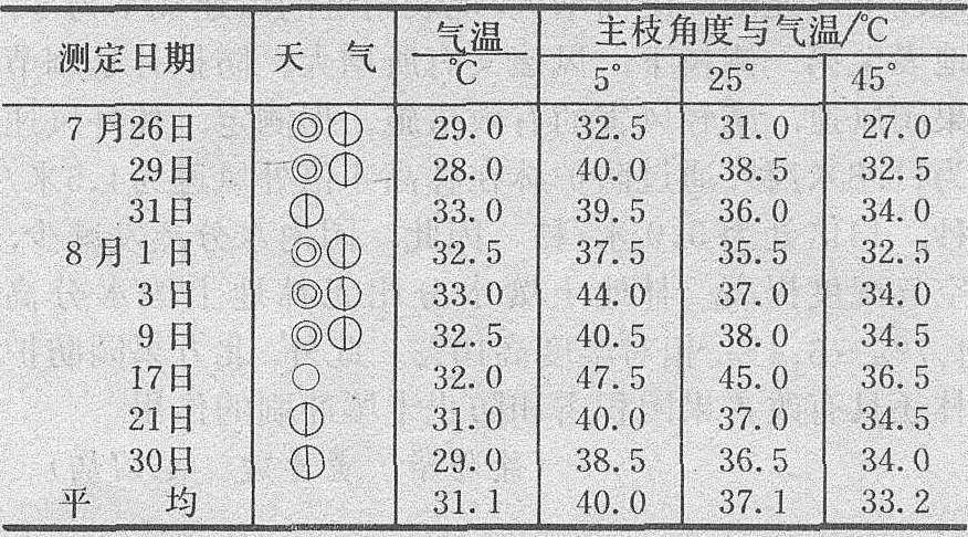 注:1.大和白桃杯状形树受光方向(南北方伸长枝)12:30:00测。 2.◎:阴;❶:少云;○:晴。 表3 苹果树树干不同方位树皮温度(℃)的日变化