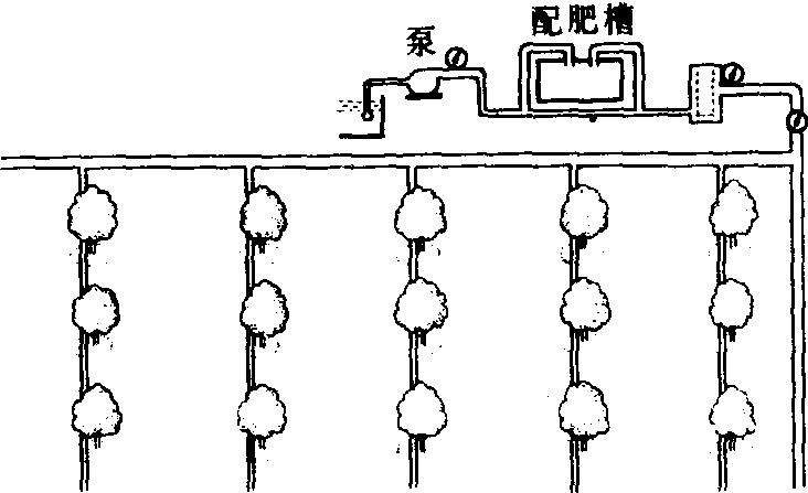 果园滴灌系统示意 果园滴灌系统的配置方式, 可按栽植距离分成三类: ❶密植园毛管和滴头布置方式。沿果树行铺设一根毛管(通常是管径16毫米聚乙烯管), 在毛管上装有间距1米、流量4升/小时的滴头两个, 如一个滴头在果树前0.5米处, 则下一个应在该株后0.5米处; ❷普通园毛管和滴头布置方式。每行铺设一根毛管, 在每株树周围安装4个流量4升/小时的滴头, 距树干约1米。在重粘土土壤上, 每株滴头数可增至5~6个, 幼树则只需要2个, 置于树的两侧,各离树干1.5米; ❸稀植园毛管和滴头布置方式。每行铺设一根毛管, 在接近每株树干处接铺一根环形绕树毛管, 圆环半径为120~150厘米, 其上均匀布设8~10个滴头( 流量为4升/小时)。对于核桃、薄壳山核桃等高大树种, 可适当增加滴头数量或滴头流量。 滴灌经济效益 主要表现在: ❶省水。滴灌直接把水送到果树根部, 减少水向深层渗透和流失, 比喷灌省水30~50%, 比漫灌省水80~92%, 越是干旱少雨地区, 省水效果越明显; ❷节省土地和劳动力。滴灌可以自动化, 不需筑沟、畦, 或挖渠道, 并可与施用化肥结合进行, 从而节省大量土地和劳动力。在滴灌时, 株行间地面大部分处于干燥状态, 不利于杂草生长, 可以减少除草工作量。 ❸提高产量。滴灌能保证果树适宜的水分状况, 协调土壤中水、肥、气、热,有利于果树生长发育和提高产量, 一般情况下, 滴灌可使产量提高25~80%。是目前果园灌溉的最佳方式。 |