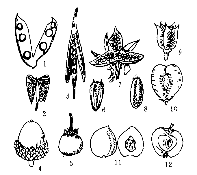 果实类型 1.荚果; 2.短角果; 3.长角果;4.坚果; 5.浆果; 6.瘦果;7.蒴果; 8.颖果; 9.蓇葖果;10.翅果; 11.核果; 12.梨果 果实被子植物特有的繁殖器官。为受精后由子房或加上花的其他部分(花托、花被)发育而成。前者称真果;后者称假果。由一花内单雌蕊或复雌蕊形成的称单果;一花有多个离生雌蕊时,与花托一起形成聚合果,由整个花序共同形成的称聚花果或复果。未受精而形成的果实为无籽果实。由果皮和种子构成,俗称的果肉即果皮的一部分或全部。按子房心皮数、果皮的质地、开裂的方式分为浆果、核果、蓇葖果、荚果、蒴果、坚果、瘦果、颖果等。 果实fruit由雌蕊子房或连同花的其他部分发育成熟的结构,为被子植物所特有的繁殖器官。许多植物的果实中富含营养物质,是人类栽培植物的目的物。果实的类型很多,一般分为单果、聚合果、复果(聚花果)三大类。单果再分为: |
