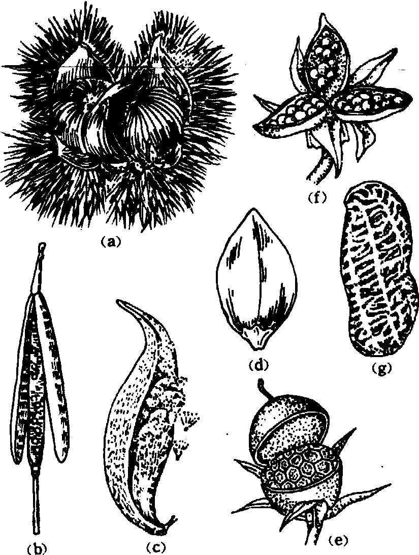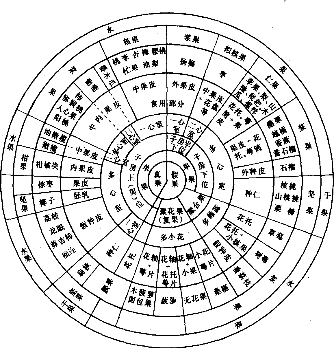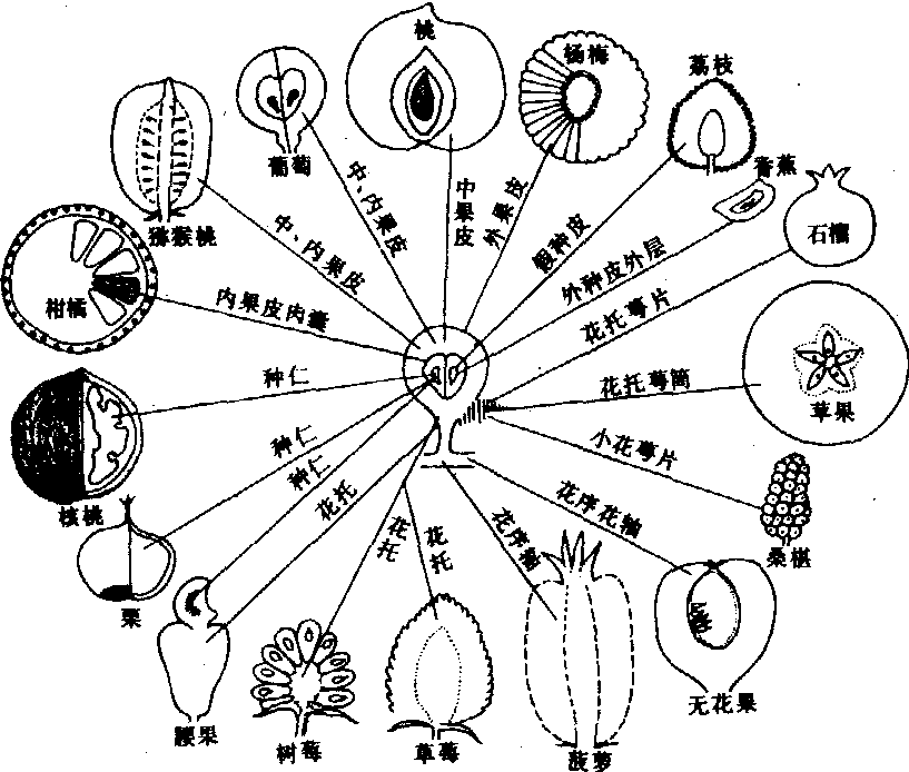 图 1 果实分类图解 果实生长期 自开花至果熟历时不等。如草莓只需20余天;树莓、樱桃、醋栗、穗醋栗, 需30~60天。杏、无花果、梅、枣、荔枝、番荔枝、石榴、番石榴、橄榄、杨梅等,需50~100天。龙眼、山楂、菠萝、猕猴桃、银杏、核桃、山核桃、榛、栗、阿月浑子、柿等, 需100~200天; 柑橘、枇杷、番木瓜、木菠萝、油梨等, 需200天左右。有些特殊品种, 需时很长,如危地马拉系统的油梨,长达300~500天; 伏令夏橙400天左右。生长期最长的, 如香榧, 春季开花,翌年成熟,历时500天以上。大多数常见果树,同种间不同品种的差异也较大,如苹果、梨、桃等,早、中、晚熟品种变动在60~200天之间; 李、扁桃、葡萄、香蕉、杧果、阳桃、越橘等, 在50~140天之间。同一品种因栽培地点、生态和栽培条件的差异,对果实生长期也有一定影响。