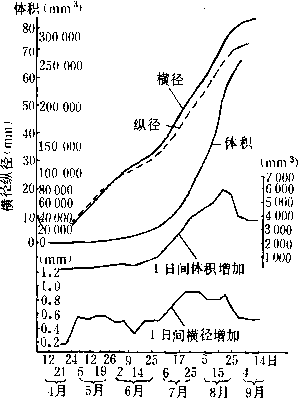 图3 二十世纪梨S型果实生长曲线 果实昼夜生长也有一定节奏, 如苹果、幼果期通常在夜间增大, 黎明后开始缩小, 午后开始恢复, 16时复原并开始增长。近成熟期,夜间和上午生长较快。 体积增长 决定于细胞的数目、体积和细胞间隙的大小。果实细胞分裂始于花原基形成后, 至开花时暂停。花后分裂则因树种、品种而异。如黑醋栗, 花后细胞不再分裂, 仅体积增大。草莓、油梨, 花后细胞继续分裂, 直至果实成熟。大多数树种介于二者之间, 大果、晚熟者在适宜的气温与土壤水分条件下分裂期较长。同一果实不同组织间分裂期也不一致。一般胎座组织先停止分裂, 随后子房壁由内向外依次停止。如苹果的果肉皮层组织, 开花至停止分裂历时21~49天,梨25~45天, 无花果42天。桃、李、樱桃、枣的中果皮20~28天, 杏15天, 葡萄10~23天, 甘柿7~18天,柑橘汁囊50~63天。表皮组织的分裂期, 大多持续较长。果肉的细胞数因树种而不同。如成熟苹果约为4000万, 葡萄60万。细胞的长度一般为150~700微米,有的超过1毫米, 石榴种子可食的表皮细胞长达2毫米。细胞体积一般106~107立方微米, 大者108立方微米。许多果实发育的后期,薄壁组织细胞间隙迅速增大, 因而体积明显增长。如苹果的细胞间隙占总体积的20.6~35.7%。