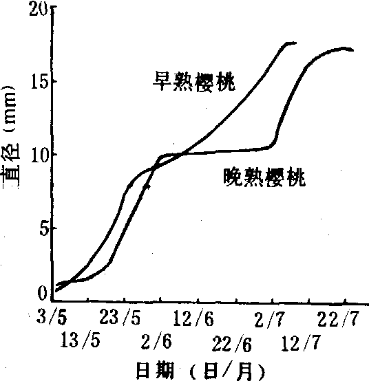 图 4 早熟与晚熟樱桃品种双S型果实生长曲线 果实的形状 多数树种果实呈球形, 近球形、扁球形、长球形、卵形、圆锥形。有的种或变种具有特定的果形, 如橄榄呈纺锤形, 柠檬呈短纺锤形, 石榴呈圆底花瓶形, 荔枝呈瘤皮卵形, 阳桃呈五棱形, 腰果呈肾形, 香蕉呈弯圆柱形, 菠萝呈圆筒形, 蟠桃呈扁盘形, 扁桃呈纵扁卵形, 桑椹呈穗形,佛手呈手形,榴连呈粗刺球形, 栗独生坚果呈尖顶球形, 边生坚果呈尖顶半球形, 中心果为纵扁平形等。同一树种不同品种间果形常有差异, 可借以鉴别品种。如枣有圆球形、长球形、圆柱形, 甚至扁球形、梨形和葫芦形、壶形等。 果实的颜色 因其所含色素不同而色泽各异, 色素种类主要有叶绿素、类胡萝卜素、花色素类等。 叶绿素 存在于叶绿体内, 随着果实成熟迅速转化消失, 故失绿变色常是成熟的标志。叶绿素的形成和转化受外界条件的影响。光是形成叶绿素的必需条件, 低温则破坏叶绿素, 赤霉素、细胞分裂素有助于保绿、乙烯、脱落酸与赤霉素有颉颃作用, 可促进褪绿上色。 类胡萝卜素 存在于有色体内,常与叶绿素并存,包括胡萝卜素和叶黄素两大类。前者有α、β、γ胡萝卜素和番茄红素, 后者有隐黄质、玉米黄质、蒽黄质、紫黄质、橙黄质和叶黄素等。柑橘类果实含有三种胡萝卜素及玉米黄质、隐黄质和叶黄素。杏含三种胡萝卜素、番茄红素和叶黄素。柿含β胡萝卜素、番茄红素、隐黄质、玉米黄质和蒽黄质。菠萝含紫黄质和橙黄质。柿、黄肉桃、杏、柑橘、枇杷等不同品种间皮色由黄至橙红的变化,与所含类胡萝卜素的种类和数量有关。如杏含番茄红素10%; 红色柿含40%, 黄柿则不含番茄红素。番茄红素形成的适温为19~24℃,高于30℃,即抑制其形成。因此, 红色柿在高温地区栽培, 果实只黄而不能达到红色, 因而影响品质。 花色素 为水溶性色素, 存在于液泡中, 酸性时呈红色, 中性时紫色, 碱性时蓝色, 与金属离子结合时, 则呈现各种颜色, 加以色素分布不一, 色彩变色很大。花色素的种类主要有花青素、甲基花青素、花翠素、3’-甲花翠素、花葵素、樱草素等。苹果、桃、李、樱桃含花青素, 葡萄含花青素、甲基花青素、花翠素、3’-甲花翠素、樱桃素等, 其中红色品种含2~3种,黑色品种4~5种。无花果含花青素和花葵素。石榴、草莓含花葵素。越橘含花青素、花翠素、3’-甲花翠素。绝大多数果树随着果实成熟, 花色素增多, 只有个别树种,如菠萝,果实成熟时花色素反而减少。花色素的形成, 需要糖分的大量积累, 光照充足, 昼夜温差大,矿质营养协调和水分适量, 满足这些条件,并适当应用乙烯利, 可促进果实着色。 果实的营养成分 成熟的果实含有多种营养成分。水果主要含糖、酸、维生素C等, 干果主要含淀粉、脂肪、蛋白质等(见果品营养价值)。 果实的风味 糖、酸、芳香物质等对感官的综合作用是决定果实品质的重要因素。甜酸不仅决定于糖、酸的含量, 而且与糖酸比有很大关系。糖酸比大者偏甜, 小者偏酸, 其间还有浓淡之分。糖、酸都高者风味浓, 均低则味淡。甜度与糖的组分有关,果糖较甜,蔗糖居中, 葡萄糖较淡。香味由挥发性物质构成, 主要为醇类、酯类和羧基化合物。不同种和品种含芳香物质种类各异, 如苹果、草莓约有20余种。各种香气的成分、浓度、可感量、相互作用及其与糖酸的配合等, 组成了千差万别的果实风味。 此外, 有的果实, 如柑橘类的某些种, 有特殊的苦味, 是由橙皮甙、柚皮甙所致。柿未熟时的涩味,是因含可溶性单宁, 单宁含量随着果实成熟而减少, 甘柿类所含的可溶性单宁还可在树上转化为不溶性而自然脱涩; 涩柿类则需经人工脱涩后才能食用。 果实fruit由被子植物的子房或连同花的其他部分发育形成的结构。果实纯由子房发育而成的,称为真果。除子房外,还有花的其他部分参加果实组成的,称为假果。如苹果、瓜类、凤梨等。