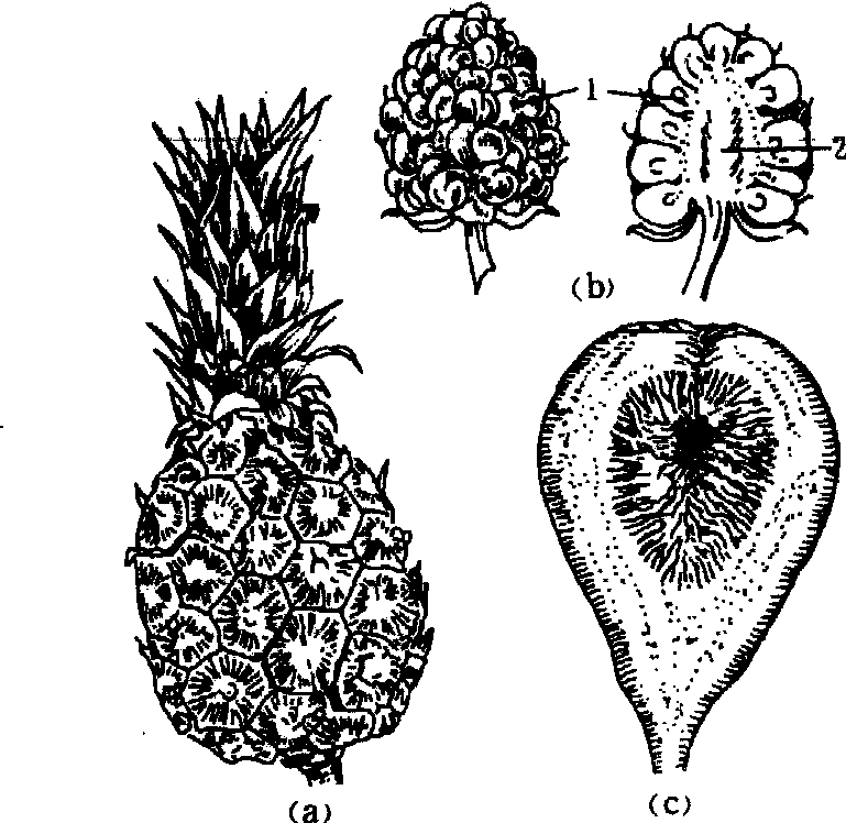 由复雌蕊、中轴胎座、上位或下位子房发育而成的果实。外果皮薄,中、内果皮肉质多汁,含1至多数种子,如番茄、葡萄等; 由子房下位的雌蕊形成的浆果如香蕉。 ❷核果。由1至数个心皮组成的雌蕊发育而来。外果皮薄,中果皮厚、肉质,内果皮坚硬,由石细胞构成硬核,含1粒种子,如桃、杏等为单雌蕊、上位子房发育成的核果。核桃则为2心皮、下位子房发育成的核果。 ❸橙果。由复雌蕊、上位子房、中轴胎座的雌蕊发育而成。外果皮革质,有油囊分布,中果皮较疏松,有维管束分布其中,内果皮膜质,分为若干室,向内产生许多肉质的毛囊,为食用部分,如橘、柚等。 ❹梨果。由复雌蕊的下位子房发育形成的果实,中果皮亦肉质化,没有明显界限,内果皮呈革质膜状,如梨、苹果等。 ❺瓠果。由3个心皮、下位子房、侧膜胎座的雌蕊发育而成的果实。外果皮与花托愈合,中果皮、内果皮或胎座发育为果肉,含种子多数,为葫芦科植物所特有。 聚合果 由一朵花中许多离生心皮雌蕊聚生在花托上发育而成的果实(图3)。根据聚合果中的小果种类可分为:聚合瘦果(许多瘦果聚生在肥大肉质化的花托上),如草莓等; 聚合核果,如悬钩子属的果实;聚合蓇葖果,如八角、芍药等; 聚合坚果,如莲。 聚花果(复果) 是由整个花序形成的果实(图3)。