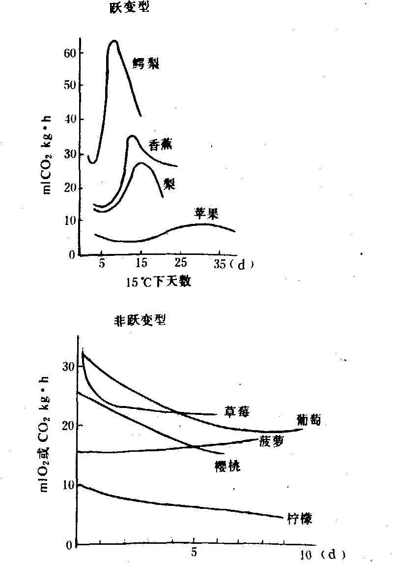 呼吸类型 果实生长发育过程中呼吸速率不断变化, 一般在受精后很高, 随果实生长逐渐下降, 长成时最低。进入成熟时, 不同果实的呼吸变化趋势不同。一类为呼吸跃变型, 果实开始成熟时, 呼吸迅速上升, 然后再下降形成一个或高或低的呼吸高峰。属于呼吸跃变型的果实有梨、苹果、香蕉、杏、鳄梨、猕猴桃等。另一类果实在成熟过程中变化平稳, 不形成呼吸高峰, 称为非跃变型, 常见的种类有柠檬、柑橘、菠萝、草莓、葡萄、樱桃等 (见图)。呼吸类型是果实采后生理最重要的特征之一 (见呼吸跃变)。