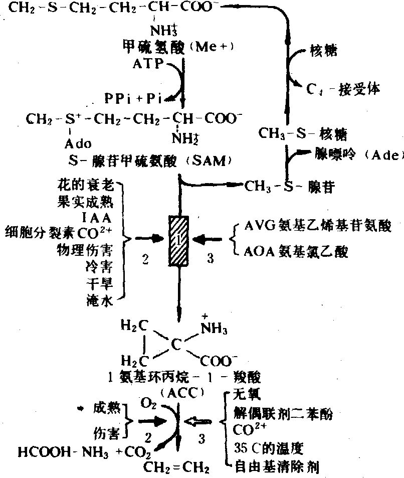 1979年美国亚当斯(D.O.Adams)和杨祥发确定了果实中乙烯生物合成的途径是:蛋氨酸→S-腺苷蛋氨酸(SAM)→1-氨基环丙烷基羧酸(ACC)→乙烯。跃变型果实在乙烯作用下诱发成熟, 成熟时乙烯刺激1-氨基环丙烷基羧酸合成, 促进乙烯产生, 形成乙烯自我催化, 而不断大量产生(见图)。跃变型果实乙烯增加的时间进程与呼吸速率上升以及其他成熟作用差不多同步进行。非跃变型果实缺乏乙烯自我催化能力。但对已经跃变的果实,外源乙烯则不再刺激呼吸增加。对于非跃变型果实,外源乙烯也能促进呼吸增加, 而且与所用的乙烯浓度成正比,除去乙烯后呼吸即恢复,不能诱发呼吸跃变和乙烯继续增加。在乙烯作用下其他与成熟衰老有关的反应都被促进,如叶绿素分解,脱绿, 增加着色; 淀粉水解, 果实软化。
