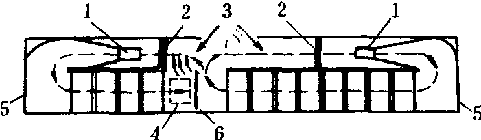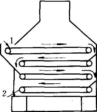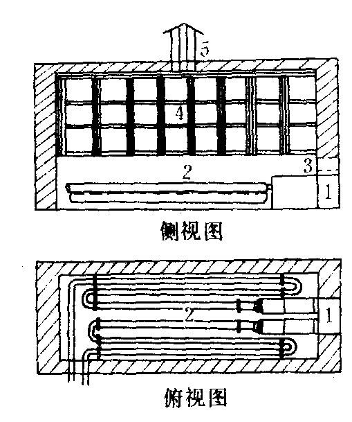 图 1 烘房示意图1. 火炉; 2. 导热管; 3. 空气入口; 4. 烘筛置放部分;5. 空气出口 隧道式干燥设备在果品干制中应用最广, 凡保持果块形状的果干均可应用。设备主体由干燥隧道、加热部分、通风排湿装置与运载设备构成(图2、图3)。根据设备内气流与干燥物料的走向有顺流式、逆流式和对流式 (即顺流与逆流的结合, 又称复式或混合流)3种。顺流式干燥车上物料前进方向与干热空气流动方向一致,果品首先接触为高温低湿热空气, 果品升温快、干燥速度大, 随干燥进行, 进入低温高湿环境, 最终干燥终点不易控制低水分含量, 适用于水分含量高的果品。逆流式干燥果品从低温高湿介质走向高温低湿介质,终点含水量低, 适于大部分果品。对流式干燥结合了顺流和逆流干燥的优点, 克服了各自的缺点。
