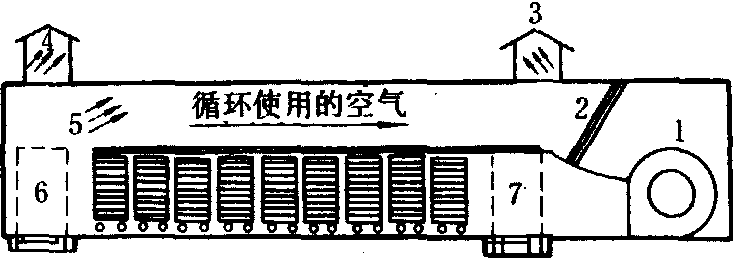 图 2 逆流式干燥设备 1. 鼓风机; 2. 加热器; 3. 新鲜空气进口; 4. 排气道;5. 循环风门; 6. 湿物料侧边入口; 7. 干物品侧边出口