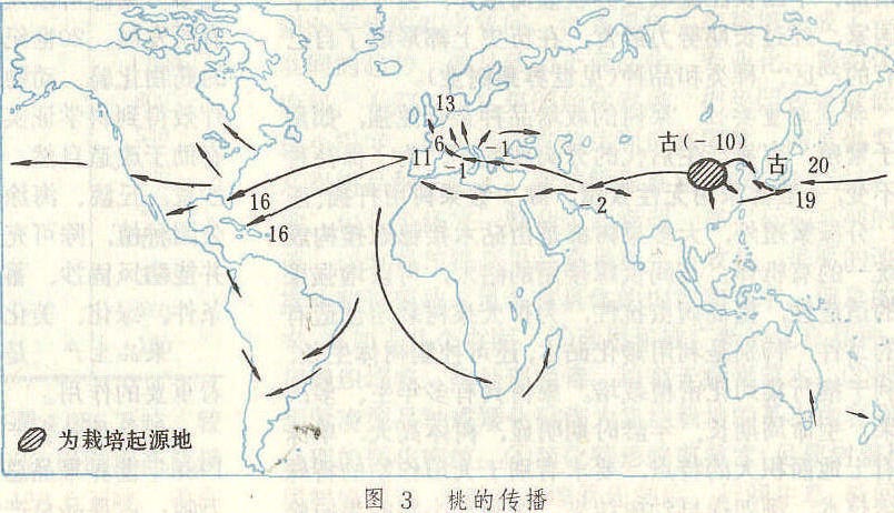 (星川, 1978年) 注: 图中数字表示公元世纪, 有“-”号的表示公元前;“古”表示年代不明的古代。 公元12世纪以来, 由于人类交往日趋频繁, 除古代已经引种驯化的少数果树外,继续引种驯化的果树越来越多,范围也越来越广, 几乎遍及全世界各地。这些果树主要有桃、梅、李、杏、樱桃、苹果、梨、葡萄、无花果、石榴、柿、枣、栗、核桃、长山核桃、甜橙、宽皮橘、枇杷、荔枝、龙眼、菠萝、香蕉、番木瓜、油梨、椰子、杧果、面包果、木菠萝、草莓、醋栗、树莓、越橘等。其中原产中国的桃公元前2世纪由中国传入波斯, 后经地中海沿岸传入法国、德国、西班牙、葡萄牙等国。9世纪在欧洲已盛行栽培。16世纪传入美国。18世纪,日本又从中国引入桃(图3)。现在桃的栽培已遍及全世界。原产新大陆的菠萝, 15世纪经葡萄牙人和西班牙人传播到印度、菲律宾、爪哇后, 于16世纪传到中国、缅甸、泰国及南非、北非各地。18~19世纪, 经荷兰而遍及全欧(图4)。这些果树引种驯化史,可以说是一部果树栽培史。与引种驯化同时, 许多国家在不同历史时期内都先后致力于果树生产的发展,并积累有多方面的经验,中国古农书关于果树栽植、果树修剪、疏花疏果、环状剥皮、嫁接、防虫、防寒以及果品贮藏加工的记述,就是一些很好的例子(见中国果树业发展史)。世界果树生产历史进程虽不完全一致, 但都经历三个重要里程碑。首先是果树品种的出现; 第二是公元前4世纪出现的嫁接技术; 第三是随着科学技术的进步,果树品种选育和栽培育苗技术日趋发达, 20世纪30年代出现的以矮化密植为中心的果树集约栽培, 促使果品单位面积产量和质量迈上一个新的台阶。