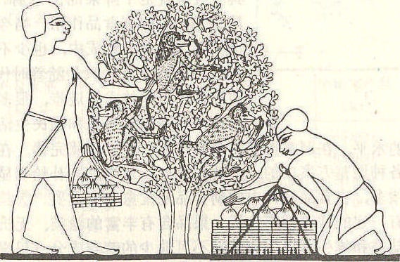 图1 古代埃及人采摘无花果的壁画 起源、发展与分布 果树一般分为落叶果树和常绿果树,又可分温带果树和亚热带、热带果树(见果树分类)。因不同种类的起源在瑞士德·康多尔(De Can-dolle) 和苏联瓦维洛夫(Н.И.Ва-вилов) 的著作中有详细的论述(见栽培果树起源)。不同起源中心的各种果树野生群落, 在人工选择和自然驯化下, 经古代人类的传播,开始有了果树的原始栽培。其中果桑、葡萄、毛叶枣 (Zizyphusmauritiana)、杧果、杏、扁桃、桃、梨、苹果、榅桲、石榴、无花果、海枣(Phoenix dectylifera)、香蕉等果树, 至今已有3 000年以上的历史。从古埃及、巴比仑、希腊墓葬石刻、壁画中可以看出古代果树栽培和果品加工的概貌(图1、2)。 ![]() ![]() 图 2 公元前2500年埃及古墓中采收 葡萄和酿酒的壁画
