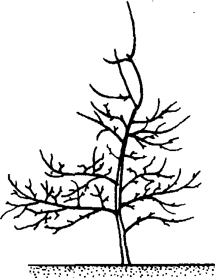 图 2 纺锤形整枝 中国古代果树整形技术比较简单。一般均任其自然生长,多数为自然形。19世纪后期, 从欧美和日本引进苹果、洋梨、樱桃等果树的同时, 也传入了整形技术, 初期强调人工强制造形, 影响果树适龄结果。20世纪30年代起, 逐步转向人工自然形, 北方落叶果树创造了主干疏层形、自然开心形、三挺身形及丛状开心形等; 南方常绿果树,则以自然圆头形、自然开心形及变则主干形为主。20世纪70年代以来, 随着矮化密植栽培的发展, 提出了中干小冠形、二层开心形等树形(见树形)。 整形依据 果树整形不仅要考虑单株个体的合理树形,还要注意果园群体结构的变化过程, 使果树的一生发挥最大的生产效益和经济效益。幼树个体独立性大, 空间充裕, 光照条件好, 单株树形结构可稍密集, 可以高留中心干(见骨干枝), 树形可稍高, 随着树龄增加, 树体扩大, 树冠开始交接, 树冠内膛和下部光照逐渐恶化时, 树形也要有所变化, 如疏除中心干,逐步落头开心或加大层间距,骨干枝回缩等等。果树整形要依树种、品种不同的生长势、发枝习性和结果习性的差异而有所不同。苹果、梨、枣、柿、橄榄等果树干性强, 宜采用有中心干树形;核果类和石榴等果树干性弱, 宜采用无中心干树形; 柑橘、板栗、核桃、荔枝等, 介于其间, 可采用自然圆头形或自然中干形; 葡萄、猕猴桃等蔓生果树, 则宜用棚架或篱壁形。果树整形还要依据栽植地区的环境条件, 如土壤肥沃、雨多、生长期长的地方, 宜用骨干枝稀疏的大树冠, 反之, 则用小冠形。冬季低温, 决定果树是否要埋土防寒, 如葡萄在冬季无需埋土的地方, 可采用高宽垂形, 而越冬需埋土的地区, 则宜用小棚架单干形, 苹果则需采用匍匐形。 树形结构 树形由两类枝构成,一类称骨干枝,包括主干、中心干、主枝、侧枝, 构成树形的骨架; 一类称枝组, 由各类营养枝、结果枝和辅养枝构成整个树冠, 并起营养树体和结实的功能, 整形过程主要是确定主干高度, 中心干的有无, 主枝数目和在中心干上分生的位置与开张角度,以及侧枝数目与着生位置。主干的高矮与栽植密度、果园位置及最后树高有关,一般树冠高度, 不能超过行距的3/4。在干寒多风、瘠薄山地的矮生果树, 树干宜矮, 如20~30厘米;在高温多湿、肥沃平坦土地上稀植的高大乔木果树, 树干宜高, 如40~60厘米。高干, 树生长较慢,顶端优势强,成形迟; 矮干, 树生长快, 成形早, 结果期也早。具有中心干的树, 容易维持树势, 寿命长, 结果面积较大, 但容易出现树冠上强、内膛空虚的问题; 无中心干的树形, 树冠内膛光照好, 果实质量较高, 但树势不易长期维持。在生产中, 有干树形常采用前期留中心干, 成龄或树冠交接后逐步回缩中心干,落头开心;而无中心干的树形, 常在生长后期, 在其中某主枝上选留斜生向内上方生长的假“中心干”,以维持树势,主侧枝的数目, 一般宜少不宜多, 或先多后少, 有中心干的树, 主枝应分层选留, 第一层主枝分枝角度宜较大(50°~70°), 第二层稍减小, 以保持上、下层之间有一定空间, 改善树冠内膛光照, 保证下部、内膛的叶片每日至少能有2~3小时直射光照。各层主枝的方向宜错落分开, 便于充分利用空间, 主枝间的生长势应维持平衡, 使下层强于上层, 主枝强于侧枝。开张角小, 留枝量多时, 枝势转旺; 反之则转弱。故可以通过改变各主、侧枝延长枝的开张角度和疏留各枝上的营养枝数量予以调节。 整形原则 果树整形是幼龄果树修剪的一项主要工作, 首先应根据不同树种的生长结果习性, 栽培管理制度, 土壤气候条件确定树形, 采用人工自然形的整形时, 应遵循以下原则: 因树修剪, 随枝作形 果树在生长过程中, 芽的萌发和枝的发生是不尽相同的,在苗木质量不一致,砧木种类不同的情况下尤其明显。在实践中几乎很难找到两株在发芽抽枝方面完全相同的幼树, 如果严格按预定的树形结构去整形, 必然将不合要求的枝条全部剪除, 令其重发新枝, 这样必然延迟成形, 推迟结果年限。因此, 只能随枝整形, 培养与标准树形相似的骨干枝结构。以主干疏层形为例,对第一层3个主枝,既可邻近, 也可邻接,1年或2年选定均可, 偶有4个也可, 只求相互方向错落, 而开张角度大小也可逐年培养, 称之谓“有形不死、无形不乱”。这样成形易、结果早。 统筹兼顾、轻重结合 整成合理树形, 是为了长期高产, 要求骨架牢固。修剪时, 应保证骨干枝的生长优势, 但为了提早结果, 又必须尽量多留枝叶, 促发花枝, 因此整形初期应当兼顾。果树每年抽生发育枝, 随着树龄增长, 在发育枝数量激增的情况下, 除选留骨干枝外, 还必须保留一定数量的辅养枝, 或作为未来骨干枝的预备枝, 这在有中心干的树形, 或自然圆头形、自然开心形等整形上都要有全面的规划。所以, 在幼龄时期应以轻剪为主, 多留枝叶, 扩大营养面积, 同时, 对骨干枝应重剪助势, 对辅养枝宜轻剪缓势, 为早成花, 早结果创造条件。以后随着枝群增加, 树势缓和, 逐步加重修剪量, 以维持骨干枝的生长优势。 平衡树势、从属分明 不同植株之间, 或同一植株的各类枝条之间, 生长总是不平衡的。整形时, 就应通过抑强扶弱, 正确疏截, 以保持果园树株群体之间长势近于一致, 一树的各主枝之间及上下层骨干枝之间的长势平衡和从属关系, 实现果树上下、内外均衡结果, 高产优质。 整形方