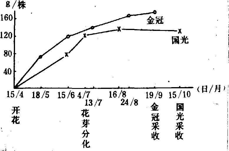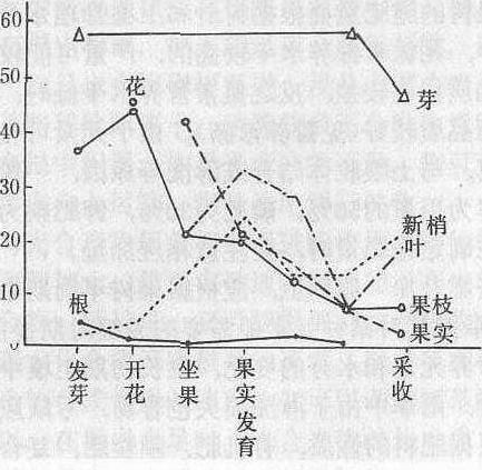 果树年周期中, 不同阶段树冠, 新生器官吸收的氮素总量是不同的。如苹果, 从萌芽至花芽分化, 氮素吸收总量的增长速度很快; 进入果实膨大期, 吸收速度渐缓, 到接近成熟期, 甚至还有所下降, 养分流入贮藏器官。