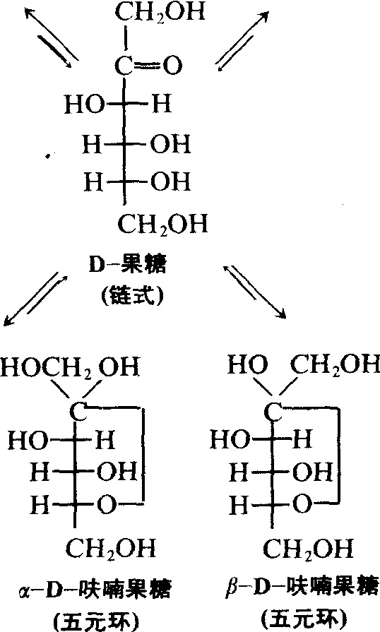 酮糖在水溶液中存在开链式结构与环状半缩酮结构的互变平衡,有变旋现象。D-果糖在水溶液中有5种互变异构体。在晶体状态下,D-果糖以吡喃型存在,在形成糖苷、低聚糖和多糖时,主要以呋喃型存在。