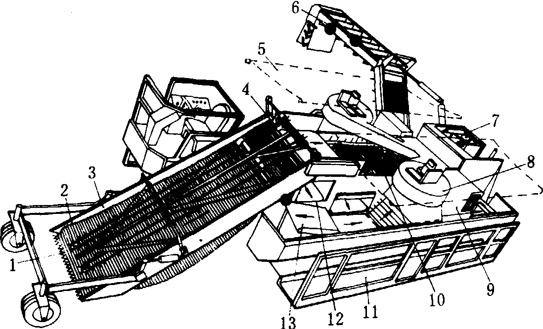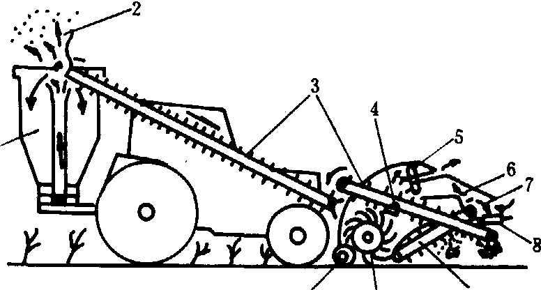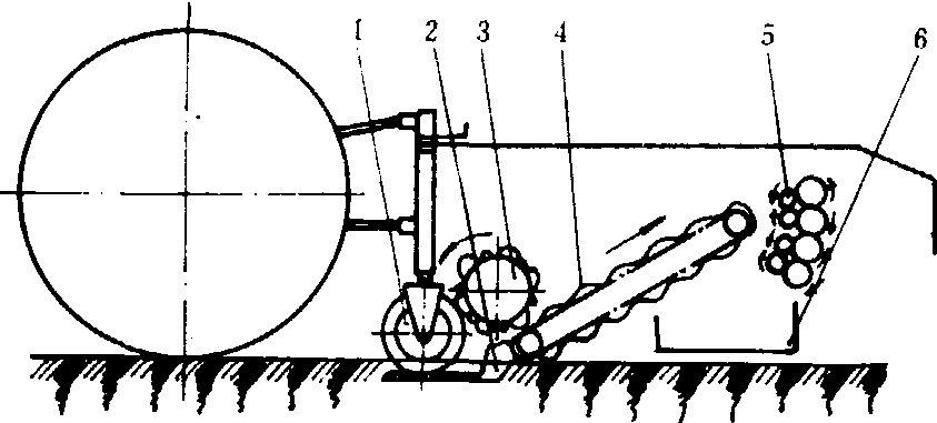 1.切割器;2.带有塑料齿的压紧链条;3.倾斜杆条输送器;4.果实和土壤