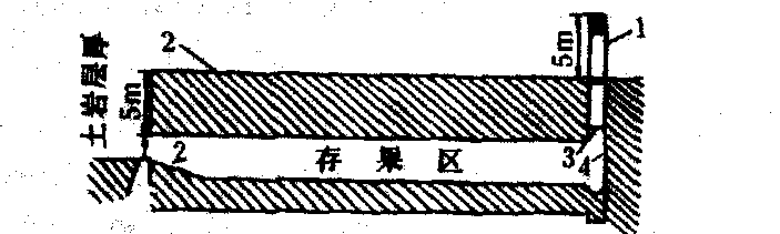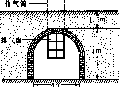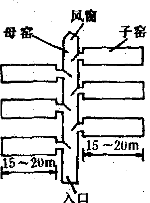 ❷窑窖:按构造不同分为土窑窖和地下砖窑窖。土窑窖是把向阳、短小、无通气筒和窖门保温结构的住房,改为果品自然通风贮藏窖。窖口向北、缓坡向下,深入地下,加长窖身(25~50米),在窖身后部设通气筒(又称风囱),窖门设缓冲带。其原理是,在秋冬季,通过自然通风的方式,将自然冷源蓄入窖洞四周的厚土层内(顶部覆土厚5米以上)。贮藏结束后,封窖保冷,可使窖洞内温度周年维持在较低的水平,从而为果品贮藏创造良好的温度环境。土窑窖按窖体的排列组合方式可分为大平窖和子母窖两种(图2、图3)。大平窖为单体窖,子母窖则是在主窖上开挖出子窖,按子窖的排列形式又可分为“非”子形窖和“梳子”形窖。大平窖由窖门、窖身和排气筒三部分组成。窖门一般设有两道门,门宽0.8~1.4米,高2~3米,两道门之间的距离4~6米;窖身为贮果部位,窖身由窖门向内缓慢降低, 比降5%~10‰,窖身长30~50米;排气筒设于窖身后部,其尺寸主要取决于窖的贮藏容积。一般经验是筒下部直径1~1.2米,上部直径0.8~1米(也可建成直筒),高5~15米。通风量的大小主要取决于排气筒内断面积,尽可能采用大直径的排气筒。子母窖由主窖(通道),子窖和排气筒组成,主窖用于运输和通风,子窖贮果,窖门为进气口,在子窖的顶端设有排气筒。这种窖能充分利用地下空间,结构较合理,贮果量较大。地下砖窑窖是在吸收土窖洞贮藏原理基础上发展起来的另一种果品贮藏窑窖(图4)。这种窖在地面直接开挖后,再砌成顶部为圆拱形的窑窖,宽4~5米,侧墙高2米,墙厚37厘米,窖顶用厚32厘米砖拱,上部再覆土1.5~2米,窖长一般30~50米,地下砖窑窖多建在平原地区。这种窖的结构形式与大平窖相似,亦由窖门、窖身和通风系统组成。窖门为一较长的坡道,坡道长10~20米;窖身根据容量大小可建成单跨和双跨(或三跨);其通风系统有自然通风方式和机械通风方式两种,自然通风系统的构造与土窑窖相似,机械通风则在窖的后端设置轴流风机。自然通风不需动力,可用于缺电地区,但通风效果较机械通风差。为提高通风效果,宜使通风量大于每小时18次。