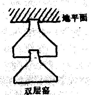 果窖 按建筑形式分为井窖、窑窖和棚窖三种。❶井窖:全部建在地平面以下,形似“三角瓶”,结构简单,建造费用低,不易坍塌,但窖的贮量小,操作管理不便,占地面积较大。井窖的结构分为窖口、窖颈和窖身三部分,可建在室内,也可建在室外。室内窖受外界气温影响小,果品贮藏初期窖温较高,后期温度低,利于延长果品贮藏时间,室外窖受外界气温影响大,贮藏初期窖温比室内窖低,但贮藏后期升温快,贮藏期比室内窖短。为弥补上述不足,可在室外建造双层窖(图1)。即在上窖底再挖一个窖,果品先存在上层窖内,后期气温回升后,移至下层窖继续贮藏。