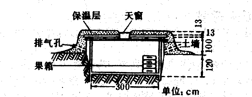 菜窖 分临时性菜窖和永久性菜窖。建窖一般选择地下水位较低和空气流畅的地点。气温较高或水位较高的地区多采用半地下式菜窖,窖身入土深1~1.5米,在四周筑起高0.66~1米的土墙。在寒冷或地下水位较低的地区多采用地下式菜窖,窖身全部建在地下,入土深2.5~3米,仅窖顶露出地面,与半地下式窖相比,地下式保温能力强,可避免冻害。菜窖的宽一般2.5~3米,长度视贮量而定(16~50米),棚顶用料就地取材,一般用木料搭好棚架,架上铺秫秸,秫秸上面覆土压实,秫秸和覆土厚度视当地气温而定。窖顶设天窗或气孔,天窗的开设方式有两种:一种是沿窖顶长方向通长设置,即为条缝式;另一种是沿窖顶长方向每隔一定距离设置一个。