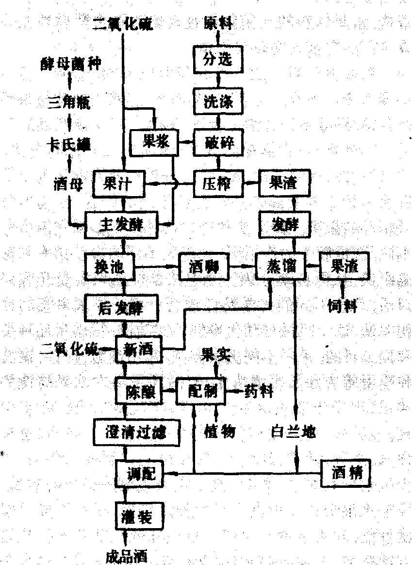 果酒生产工艺流程 原料选择 酿酒用的果实以汁液多,糖分高,酸度适中和色香味具佳的品种为最适宜。成熟的水果,糖分积累高,色香味最理想,营养价值高,质地疏松,有利于酿造。原料种类很多,主要有葡萄、苹果、桔子、山楂等。 破碎 果实破碎后使果汁流出,便于压榨和发酵,也有利于色素的溶解。不同的果实其组织质地不同,采用的破碎设备各异,如杏、李、桃、柑桔、刺梨等宜采用齿形的双辊筒破碎机;苹果、梨等宜用单辊筒破碎机。 压榨 破碎后只有部分自流汁流出,而果实中的汁液需经压榨后才能充分取出,并将果渣分离(见苹果汁加工)。 二氧化硫的添加 二氧化硫具有阻止或延缓微生物繁殖的作用。果汁中添加适量的二氧化硫后,仅有酵母类可在发酵时生长繁殖,而其他微生物的生长被抑制。二氧化硫除起到杀菌防腐作用外,还具有澄清、溶解、增酸和抗氧化作用。果酒生产中常以液体二氧化硫、亚硫酸或固体偏重亚硫酸盐等方法添加,添加量视品种、酸度高低而定,常用量为50~250毫克/升。 酵母的扩大培养 酿造优质果酒均需添加人工培养酵母。葡萄酒酵母具有发酵能力强,耐酸和抗二氧化硫等特点, 是果酒酿造的优良菌种, 通常用纯种酵母, 经三角瓶、卡氏罐等逐级扩大培养, 各级酵母浓度应达108~109个/毫升,接种量为2%~5%(体积比)。 果汁成分调整 包括:❶糖分调整。根据实际生产经验,每升果汁中含17克糖经发酵后产生纯酒精1度, 一般果酒含酒精应在10~18度为宜, 所以需根据果汁原含糖量及要求产品达到的酒度调整糖分。生产上多用精制砂糖,先将糖溶解在少量果汁中,然后再加入到全部果汁中。 ❷酸度调整。果汁中的酸度以0.6%~1.0%(以酒石酸计)为宜,即适合于酵母菌生长,又能给酒以浓厚的风味,并增加色泽。果汁酸度过高时,可加糖浆或加酸度低的果汁调整,也可用酒石酸钾中和多余的酸;果汁酸度过低时,可加有机酸,最常用的是柠檬酸和酒石酸,也可加酸度高的果汁调整。 ❸含氮物质的调整。酵母营养需要一定的氮素,若果汁中含0.1%以上的氮便可满足要求。葡萄汁含氮量较高不必调整,而苹果、梨、柑桔等含氮量较低,可添加0.05% ~0.1%的磷酸铵或硫酸铵以促进酵母的发酵作用。 主发酵 发酵容器有发酵池、罐和桶,分开放式和密闭式。开放式发酵速度快,但酒精和芳香物质损失较多,也易感染杂菌,故多采用密闭式。依发酵时物料状态,主发酵分为分离发酵法和混合发酵法,前者是果品破碎后经压榨取汁,仅有果汁入池发酵;后者是果品破碎后,果汁、果浆和皮渣一起入池发酵,发酵旺盛时,皮渣极易上浮形成酒帽,若酒帽长期与空气接触,将会造成氧化过度或引起杂菌污染使酒变质,同时也不利于色素的溶解。因此, 发酵前应采用帘子或隔板等方法将皮渣压入果汁距液面20~30厘米处。主发酵依品种、酒质要求及环境的影响, 发酵温度常控制在20~30℃,约需4~7天即可换池(桶)进入后发酵。 后发酵 适宜的温度约20℃,发酵时间一个月左右。主发酵完成后的原酒还含有少量的糖分,在出酒转换容器时得到通风,酵母菌又重新活化,继续发酵将剩余的糖转变为酒精。通常后发酵完成后新酒糖分降到0.1%左右。 陈酿 经过后发酵的新酒或新配制酒,往往有生酒味,需经过一段贮存期使酒体变得芳香、醇厚,并具有一定的稳定性。陈酿常在地下室进行,适宜的温度为8~16℃,时间最少半年,最好两年以上。在自然条件下,果酒的成熟需2~3年,为了缩短生产周期,可以应用冷热交互处理法,加速果酒的成熟。陈酿过程中,贮酒容器顶部若有空隙须及时添满,防止杂菌的感染,陈酿期间出现的沉淀物须定期换容器除去。贮酒容器主要有贮酒池、贮酒罐和贮酒桶。贮酒池和罐基本为密闭式,它们可与主、后发酵设备通用,贮酒桶一般用橡木制作,中间粗,两头细。 澄清过滤 果酒除应具有色、香、味的品质外,还必须澄清透明。对于经过较长时间贮存仍未澄清的果酒,须人工加速澄清,常采用加胶和过滤等方法。加胶用的澄清胶剂种类很多,各种类型的酒有其较适用的胶剂,一般葡萄酒、苹果酒、梨酒等宜用明胶或蛋清;猕猴桃、杏子酒等宜选用琼脂,添加量需通过小型试验而定。机械方法采用高速离心机或石棉、硅藻土过滤机分离沉淀及悬浮微粒,达到澄清。 调配 原酒经过陈酿,出厂前要按照成品的质量要求对酒度、糖度、酸度进行调配,使果酒的风味协调而更且特色。一般在同一品种的原料中,选用不同酒龄,不同色泽和不同工艺生产出来的原酒进行勾兑,保证产品的质量稳定性。 蒸馏 蒸馏分为固态蒸馏和液态蒸馏,其目的是利用沸点的不同将发酵后产生的酒精全部蒸出,同时有部分醇、酸、酯等有机物质一并蒸出,从而制得具有一定芳香味和酒度较高的蒸馏酒。最常见的蒸馏设备有壶式蒸馏器与蒸馏塔。蒸馏过程中,最初蒸出的酒叫“头酒”,其中含有沸点较低的醛类物质,有异味,且对人体有害;最后蒸出的部分酒叫“尾酒”,因含杂醇油(如戊醇)有毒性,所以蒸馏酒往往要“掐头去尾”,只取“酒心”做饮用酒。由果实的浆汁或皮渣经发酵蒸馏制成的蒸馏酒称为白兰地,葡萄白兰地数量最多,往往直接称之为白兰地,而其他果实白兰地则需要冠以果实名称,如苹果白兰地等等。成品白兰地的酒度约为40~50度。 |