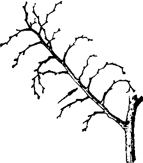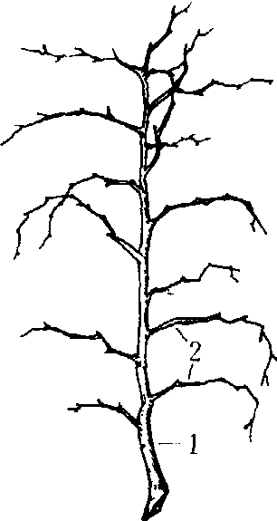 | 释义 | 枣头jujube shoot枣的发育枝。是形成骨干枝和结果基枝(枝组)的基础, 当年生的枣头由一次枝、二次枝和三次枝构成 (见图)。 落叶后的枣头 一次枝是枣头的轴枝, 长度可达1~2米。顶端具顶芽;基部3~8节为短节, 不具叶, 所生的脱落性二次枝各节具叶,叶腋常着花,但多不能坐果;短节以上为长节, 节数自数节至十余节不等, 每节具叶, 叶序为2/5式, 成“之”字形生长,每节叶腋具主芽、副芽各一个,主芽当年不萌发, 副芽当年萌发成非脱落性二次枝。 二次枝随一次枝伸长而相继萌发生长, 节数为7~15节,无顶芽, 各节具叶, 叶序1/2式, 每节叶腋具主芽、副芽各一个,主芽当年不萌发, 副芽萌发为三次枝。 三次枝随二次枝伸长而相继萌发生长, 属脱落性枝,一般有10~25节, 秋季与叶同时脱落。翌年春季,一次枝顶芽一般能继续萌发枣头, 其余各节的主芽一部分萌发为枣股或枣头, 一部分成为隐芽。隐芽寿命长, 受刺激时可萌发为枣头或枣股。二次枝上每节的主芽大多萌发为枣股, 少数萌发为枣头。枣头不但有扩大树冠、形成骨干枝的功能, 而且形成大量的二次枝, 并由此形成大量的枣股, 增加结果部位。 枣头vegetative shoot of jujube枣树上生长旺盛的生长枝。是构成树冠的主要枝条。一般每一生长季萌发一次,常自上一生长季枝条上的顶芽或叶腋间主芽萌发形成,也有从上季的二次枝的腋芽、枝条的隐芽,或枣股的顶芽受刺激萌发而成。其叶腋副芽随即萌发成枣头二次枝。