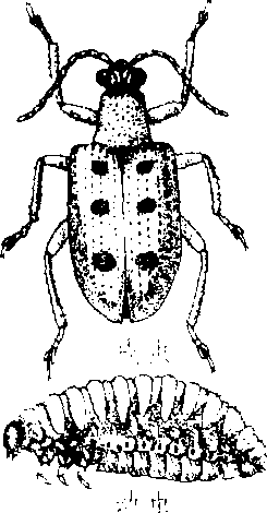 | 释义 | 枸杞负泥虫tenspotted lemaLema (Micvolema)decempunctata Gebler,昆虫纲,鞘翅目,叶甲科。分布于华北、华东、西北、西南及湖南;朝鲜、韩国、日本、俄罗斯也有分布。寄主为枸杞。成虫体长约5.6 mm,头、胸蓝黑色,有点刻;鞘翅黄褐色,点刻纵列,有10个黑色斑点,故又名十点叶甲,不同个体间黑点数有差异,有的部分或全部消失。幼虫体长约7 mm,背负污绿色粪便。以成虫和幼虫啃食叶肉。5月份为害重。卵产于叶片上,常10余粒排成“人”字形。成虫具假死性。3月中旬结合中耕,翻耕树冠下土壤可消灭虫蛹。