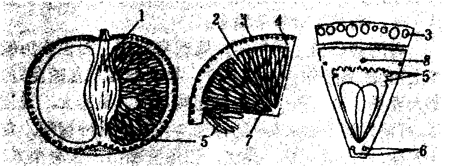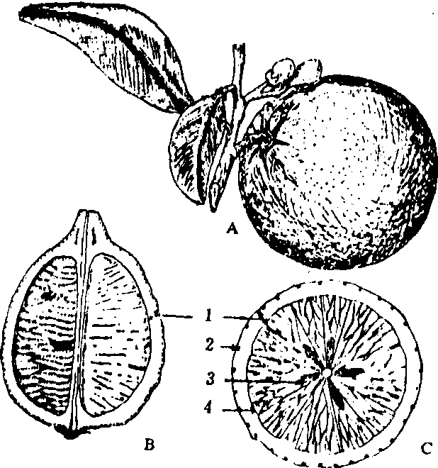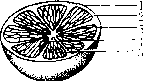 酸橙的柑果横切面 1.外果皮 2. 中果皮 3. 内果皮 4. 种子 5.毛囊 |