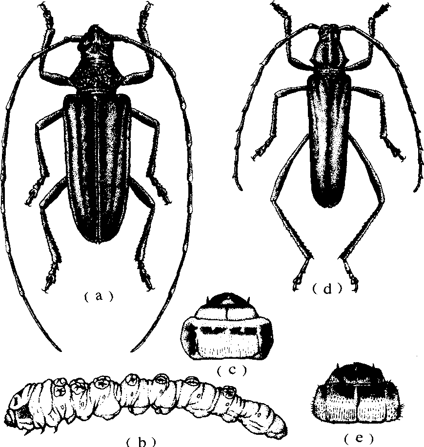 (a)褐天牛成虫; (b)褐天牛幼虫; (c)褐天牛幼虫头与前胸;(d)光绿天牛成虫; (e)光绿天牛幼虫头与前胸