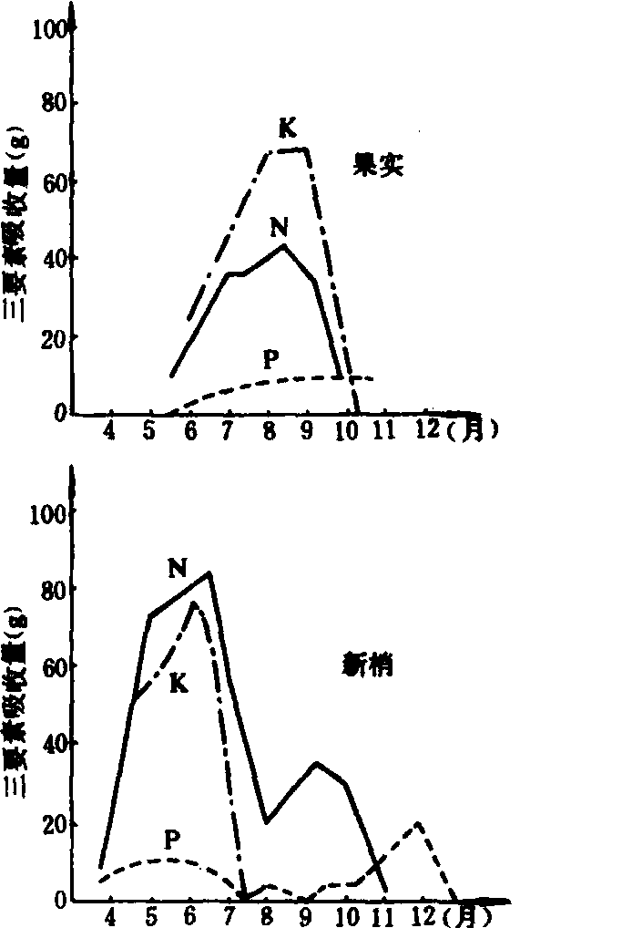图1 温州蜜柑成年树的新梢及果实中 N、P、K吸收量的季节性变化 氮营养 树体内的氮,以叶片的分配比例最高,约占35%~40%,枝干次之,为26%~28%,根和果实中最低,大致在10%~23%。叶片中含氮量对产量和品质有深刻的影响。叶片含氮量低时,干径增长量小,产量低,果实含酸量高,含糖量低,着色也较差;含氮量过高,干径增长量也减少,果皮增厚,产量降低。同时,氮过多时,树体内形成大量赤霉素,抑制乙烯的生成,从而使花芽的形成受阻,导致产量降低。此外,温州蜜柑的浮皮果也因施氮过多而加重,这在果实发育后期尤为明显。 磷营养 树体内的磷,以花、种子及新梢、新根的生长点等器官含量高,而枝干部分含量低。在不同生育期,因其生长中心不同,器官中的含磷量也有变化。开花期以花中含磷量最高,谢花、幼果期以新抽生的嫩叶最多,果实形成并开始膨大以后,则以果实和新叶为多(图2)。满足磷的供应,可促进花芽分化,提高产量,使果汁、糖分增加,酸度降低,品质改善。
