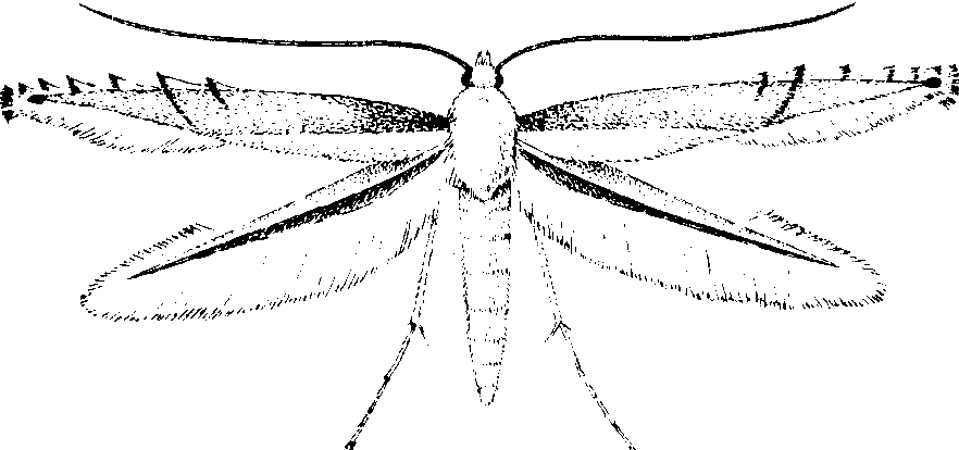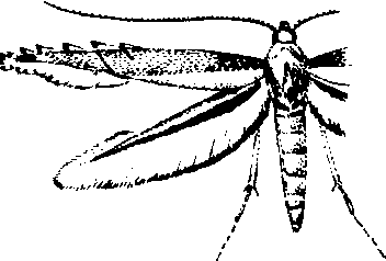 | 释义 | 柑橘潜叶蛾citrus leaf-miner在柑橘新梢嫩叶表皮下蛀食为害的害虫之一。又名橘潜蛾。学名Phyllocnistis citrella Stainton。鳞翅目,叶潜蛾科。分布于亚洲,非洲和大洋洲。幼虫主要为害柑橘类植物,受害叶严重卷曲,入冬常大量落叶,影响柑橘树冠的扩大。叶片被咬食的伤口,常诱致溃疡病蔓延。苗木幼树受害较严重。以夏秋季抽梢期发生最盛。冬、春梢受害很轻。成虫银白色,体长2毫米,翅展4毫米左右,触角呈丝状,前翅为披针形,翅基部有两条黑褐色纵纹,长约及翅之半,翅近中部具“Y”形黑褐色斜纹。前缘中部至外缘有橘黄色缘毛,顶角有一黑色圆斑。后翅呈针叶形,缘毛长(见图)。卵白色透明,椭圆形,底平,弧圆形隆起,表面光滑。幼虫黄绿色,扁平无足,头三角形。第三龄幼虫体长3~4毫米,腹部末端有一对细长的尾状物。蛹黄褐色,纺锤形,长约2.5毫米,头顶有倒“Y”形穿茧器,蛹体外有黄褐色薄茧。