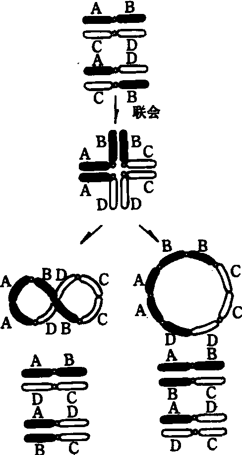 易位的生物体有易位纯合体和易位杂合体两种。易位纯合体生物,减数分裂时染色体配对正常。因此,易位染色体可以从一个细胞世代传到另一个细胞世代。但因易位可使两个正常的连锁群改组为两个新的连锁群,所以易位纯合体在自然界繁衍时就形成了新的“核型”或新染色体小种。如月见草属和蔓陀罗属内的一些变种就是由于染色体在进化过程中不断发生易位的结果。易位杂合体则不同,由于正常染色体和易位染色体的同源部分的配对,在减数分裂中期可以看到特有的十字形图像(见图)。随着分裂过程的进行,十字形逐渐开放,邻接的两个着丝粒趋向一极或两极,形成环形或8字形图像。前一种染色体离开方式称为邻近离开,后一种方式称为交互离开。相互易位杂合体的花粉母细胞中大约有50%的图像呈环形,属邻近离开,50%呈8字形,属交互离开,说明四个着丝粒趋向两极是随机的,行动是独立的。