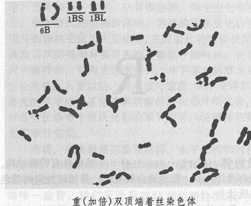重(加倍)双顶端着丝点染色体 这种个体的两条同源染色体着丝点断裂,形成两对端着丝点的染色体,即20″+t″ +t″(见图)在普通小麦中这种重双顶端着丝点染色体已成套。在减数分裂时配对和分离都正常。