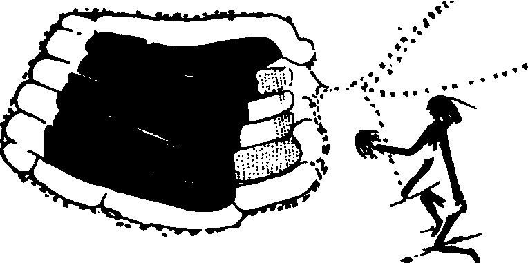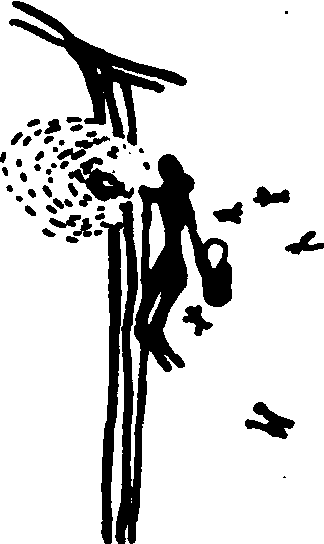 图1 西班牙比柯普蜘蛛洞里猎取蜂蜜的壁画 20世纪70年代,人们在南非的德拉肯斯山脉(Drakensberg mountains)和津巴布韦发现4000多幅属于7000年以前中、新石器时代的石刻壁画,其中有70多幅是关于蜜蜂、蜂巢、蜂脾以及采集蜂蜜活动的石刻,属于非洲南部游牧民族之一的丛林人(Bushmen)的作品。在津巴布韦靠近托福瓦纳(Toghwana)大坝马托波(Matopo)山区的一幅图画,图中显示猎蜜人用火举向蜂巢,熏逐蜜蜂,并有蜜蜂从蜂巢飞出(图2)。此外在土耳其北部也发现了类似的蜜蜂壁画。