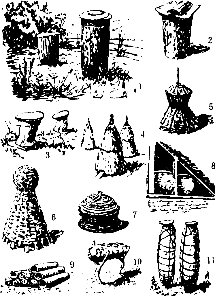 图2 津巴布韦马托波山区的古代取蜜壁画 蜜蜂的驯养时期 原始社会,只是把蜜蜂随便放在一个容器中饲养,任其自生自灭,需要时割取一些蜂蜜和蜂蜡,方法极为简单。人们生活上使用的容器被偶然飞来的蜂群占用为蜂窝,或者是人们将蜜蜂居住的空心树段设法搬到住所附近,对蜂群略加照料,使它们能生存下来时,就开始了家养蜜蜂。大约在公元前5000年以后的大部分新石器时代,人们制造并使用陶瓦器皿;在地中海沿岸的人们使用陶罐作为蜂窝;中东地区和古埃及人使用粘土作的粗管平放重叠在一起作蜂窝。以后,人们编织筐篓用作蜂窝。(图3)