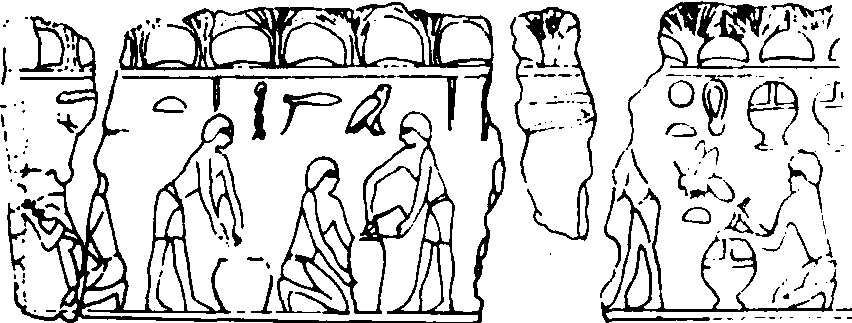 图3 古代养蜂使用的各种容器 在公元前3000年,古埃及人就在尼罗河的上下游进行转地养蜂。因为上埃及的季节较早,养蜂人就把蜂窝放在木筏上,在一个地方采完蜜以后,沿尼罗河转移到另一个有蜜源植物开花的地方。 在埃及的阿布西尔(Abu Sir;Abu Ghorb)建于公元前2400年的太阳神庙石墙上, 一幅古代养蜂的图画(图4): 一个人正在用烟熏堆在 一起的陶罐蜂窝,另一些人在过滤蜂蜜,把蜂蜜装在小坛里,画上还有一只蜜蜂。