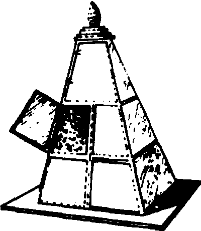 图5 希腊的上梁蜂窝(R 戈丁1847年的改进型) 17世纪欧洲已经有人用镶着玻璃的观察箱养蜂,研究蜜蜂的生活行为(图6)。也有人使用木板制成简单的蜂箱养蜂,随后仿照人们住房的式样,制造了各式各样的木板蜂窝。其中有一种并列式蜂箱,它由3个横向的木箱组成,箱与箱之间的侧壁有栅形通道,中间的木箱是育虫区,两边的木箱供贮蜜用。(图7) 1586年西班牙L.M.托里斯指出蜂王是一只产卵的雌蜂。随后英国C.巴特勒在所著的《巾帼王朝》(1609)中肯定“蜂王”实际上是“蜂后”,因为他亲眼看到它产卵,同时指出那些与众不同、体格粗壮的蜂是雄性的。著名荷兰生物学家J.斯旺莫丹首次通过解剖证实了蜂王和雄蜂的性别。英国R.雷姆南特在《蜜蜂的论述或生活史》(1637)一书中指出,所有的工蜂都是雌性的,它们拥有抚育新生一代的优越条件。