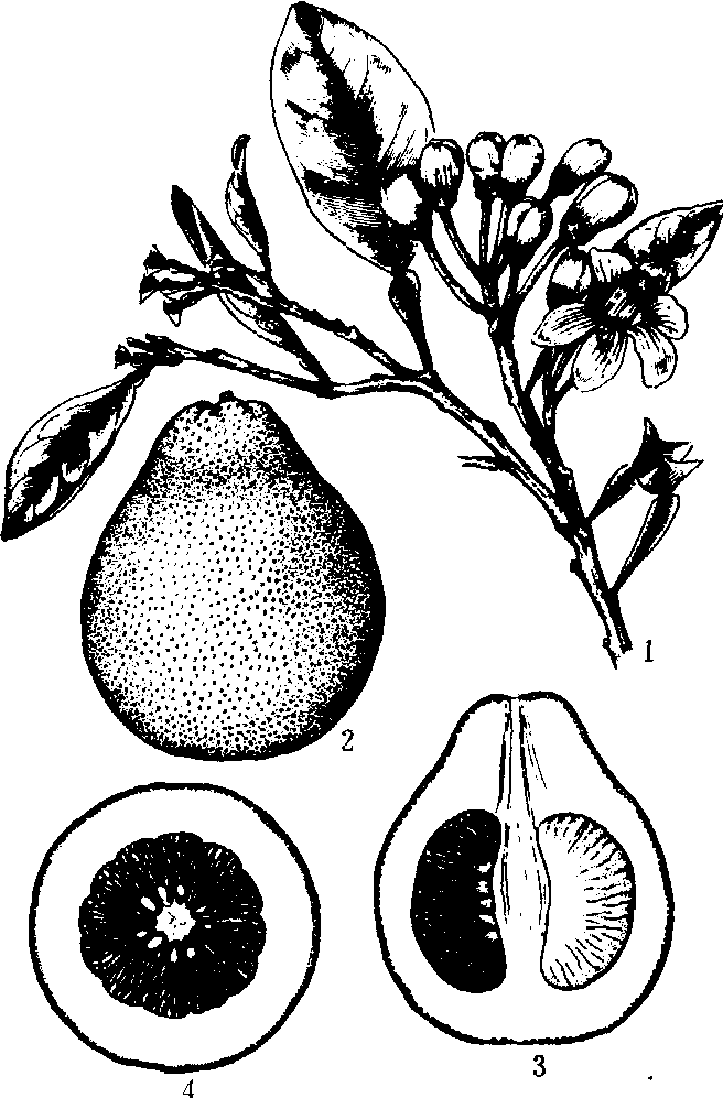 主要品种 柚的品种类型繁多。主要的栽培品种有: ❶沙田柚(见图)。原产广西容县沙田乡。广西、广东、四川栽培较多, 福建、湖南、浙江、江西等省也有少量栽培。树势强旺,树冠高大,呈圆伞或塔形, 枝梢密生。叶卵圆形, 叶缘具波状锯齿, 翼叶中大, 心形。果形大, 重量达1 500~2 000克。果顶部有印环圈, 环内微突起,俗称金钱底,这是本种特征之一。果形有梨形或长颈倒卵形,果皮黄色,稍厚、较光滑,油泡中大、密生微突。囊瓣12~15, 长肾形, 中心柱小、充实, 汁泡细长, 淡黄白色, 味甜无酸。每果有种子75~150粒。11月成熟。贮藏2~3个月汁泡柔软,风味更佳。 ❷文旦柚。原产福建漳州,后逐渐引种到浙江、广东、台湾等省。树势中等, 树冠开张呈圆头形。叶椭圆,浓绿有光泽, 刺小。果为扁圆形, 中等大小,一般重约700~1300克。基部稍尖圆,顶部突而微凹,果皮黄色,有光泽, 油泡疏生。囊瓣16~18, 肾脏形,大小整齐, 中心柱充实, 汁胞短纺锤状, 淡黄白色, 柔软多汁,甜而微酸, 有清香味, 品质优良。种子楔形,每果有80~100粒。9月中旬以后成熟。产量高、结果龄长。 ❸晚白柚。原产马来西亚半岛, 20世纪20年代引入台湾省, 其后又引入福建、四川等省。树冠圆头形, 长势强健, 枝梢粗壮, 具披垂性, 嫩枝茸毛多而明显。叶长椭圆形, 先端钝基部圆,叶缘茸毛明显。枝梢基本无刺。果很大, 一般1000~2000克以上。果顶平, 印圈不明显, 果皮黄色, 皮厚不易剥离, 油泡中等大,平生而密。果心充实, 囊瓣13~18, 不整齐,半圆形, 汁泡大, 形状不一, 柔软化渣多汁, 味甜微酸,具芳香味。每果有种子60~100粒。晚熟, 福州12月至翌年1月成熟, 四川则更晚些, 耐贮藏。品质优良,对风土适应性强, 进入结果期较早, 是晚熟良种。 ❹四季抛。原产浙江平阳、瑞安等地, 福建福鼎有试种, 因每年开四次花, 故名。树势中等稍强, 为圆头形或半圆头形。枝梢节间短,密生茸毛。叶广卵形,全缘具浅波锯齿, 翼叶为掌扇状。第一次花开于4月底5月初,以后每隔20天左右开花, 但以第一、二次花成果可靠,以后两次花多数不实。果卵圆形, 中等大小,重约700~1300克。果皮黄色,光滑。囊瓣12~15,肾形, 汁泡柔软多汁, 化渣, 味甜酸适口,具有清香,品质好。种子约20粒, 鸟嘴形或心脏形。11月中旬至12月底成熟, 耐寒力较差。 ❺垫江白柚。原产四川垫江县, 由实生树中选育而得。树势强盛, 树冠高大, 开张, 呈圆头形。枝叶茂密, 小枝老熟后多光滑, 叶椭圆形。果大,平均重1250克。顶端圆, 微具环纹, 花柱多宿存,蒂部微凹, 具放射沟纹。果皮厚, 黄色,表面粗糙, 油泡大而密,多平生。囊瓣12~16, 梳形,果心空, 成熟时囊瓣内缘多开裂, 汁胞肥大多汁, 脆嫩化渣, 甜酸适中而味浓, 品质上等。12月成熟。不耐贮藏。 ❻金兰柚。原产江西双金、永新。广东, 湖南省亦有栽培。树冠圆头形, 稍开张, 树势旺盛, 枝有短刺。叶卵圆形, 具波状锯齿。果实卵圆形, 常具短颈, 中等大小,重约900克左右。顶端圆, 蒂浅凹, 四周隆起。果皮光滑,黄色, 油泡脆嫩。味甜酸具香味,品质良好。11月上旬成熟。耐寒力较弱。 ❼安江香柚。产于湖南黔阳及邵阳地区。树冠高大, 阔圆头形, 树势强旺, 抽枝略纤细、稀疏。叶长椭圆形, 叶缘具波状锯齿, 翼叶大、心脏形。果实长卵形, 果大, 平均重1180~2700克。果皮黄色, 较厚, 油泡密生, 中大。具浓香, 故名香柚。囊瓣12~14, 长梳形, 中心柱空, 汁泡长纺锤形, 排列整齐, 渣少汁多, 味甜酸适中而具清香, 品质中等。种子甚多, 130粒左右。9月下旬至10月上旬成熟。耐寒耐旱, 较丰产, 甚耐贮藏, 为湖南地方优良品种。 ❽慈利金香柚。原产湖南慈利县。树势中等, 树冠较直立, 分枝较密。叶椭圆形,叶翼较大。果较小, 重约500~800克, 长圆柱形,果顶部较阔。果皮最大特点是金黄色, 油胞含特殊芳香, 易剥皮。种子较少或退化。汁泡淡黄色, 柔嫩多汁, 甜而芳香。品质优良, 是具有独特性状的良种。10月下旬至11月上旬成熟。耐寒耐旱能力都较强。 ❾麻豆文旦。台湾南部的主要品种, 以台南的麻豆品质最佳。树势较矮小, 圆头形而下垂, 枝条粗短, 密被茸毛。叶大而厚, 翼叶大, 叶背被茸毛。果广卵形至梨形,重约500~800克。成熟时果面淡黄色或带绿黄色,油泡大而微突。果皮厚约0.8厘米,海绵层白色。囊瓣12~16,囊皮白色, 薄而韧, 果肉淡绿黄色, 略粗脆,少汁、甜酸适度, 有时微苦。种子大, 楔形, 白色单胚。8月下旬至10月下旬采收。品质上。原种系在1700年前后自闽南或广东传入。 ❿桑麻柚。产广东德庆。早熟, 9月中旬至10月中旬成熟。果实梨形, 肉爽脆,多汁、甜酸适度, 无苦味, 品质中上。树势强, 生长粗放, 丰产。有自花不实或半自花不实现象。 此外, 尚有湖南的大庸菊花心柚, 湖北的来凤红蜜柚, 浙江的楚门文旦, 四川金堂的无核柚, 福建的琯溪蜜柚、渡尾无核蜜柚, 重庆的五步柚等地方良种。 栽培技术要点 多采用嫁接繁殖。砧木多用本地区的酸柚。沙田柚以枳作砧木表现矮化, 早结果。株行距5~6米。定植最好在春季, 种植后半月, 新根长出后要勤施以氮素为主的薄肥。进入结果成年树则要注意钾、磷肥配合。柚树着重在过冬后春梢前施一次浓厚有机氮肥,以壮梢催花;生理落果后要施肥保果并进行根外追肥; 夏末要施肥促秋梢; 花芽分化前要施壮果肥, 可加施钾肥为来年高产打下基础。柚以春梢为结果母枝, 采