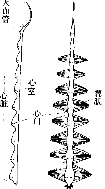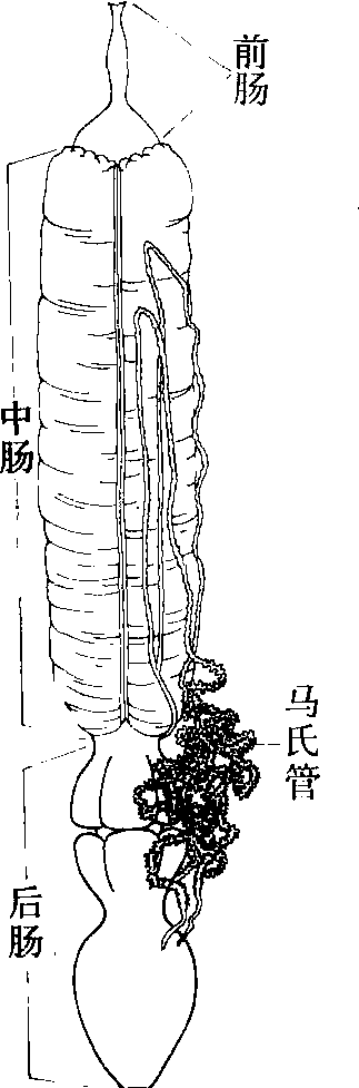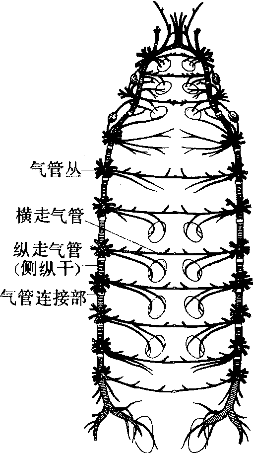 图 2 柞查幼虫循环器官 排泄器官 柞蚕固态排泄物主要通过排泄器管——马氏管排至体外。马氏管共三对,基部合成两根短管,开口在幽门瓣后腹面两侧,管内排泄物由这两个开口进入后肠,再随同食物残渣以粪粒形态由肛门排出。 呼吸器官 柞蚕是通过气管系统进行呼吸的。气门位于蚕体两侧,幼虫期共9对,即前胸1对,腹部第1~8节各1对。气门外观呈椭圆形,在气门口内具有控制气体出入的启闭构造。在每个气门内气管分枝成丛,气管丛又一再分支,形成了遍布体内的复杂的气管网。蚕体内气管系统的分布可分为纵走、横走两大类。纵走气管以纵贯蚕体两侧的一对侧纵干为主,直径大,又接近气门,是气体交换的主要通道。横走气管由气管丛发出,分布至各内部器官组织,气管在组织上与体壁相似,但层次相反,相当于表皮的内膜的一部分。特化成环绕气管壁的白色螺旋丝,这就大大增加了气管壁的弹性和延展性,使气管经常保持扩张的状态(图3)。