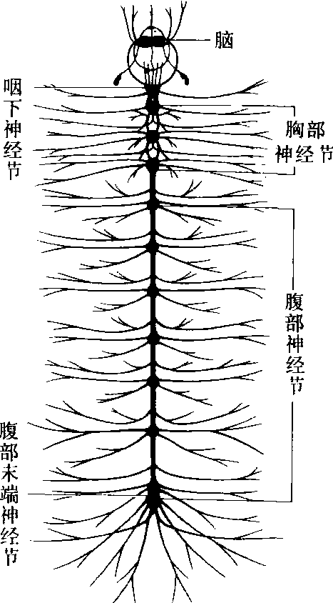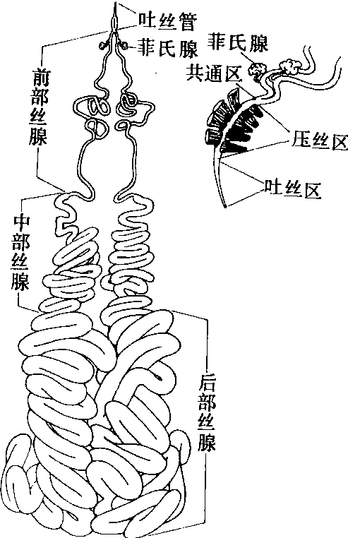 内分泌腺 柞蚕的内分泌腺中功能已经明瞭的主要有咽侧体和前 图5柞蚕幼虫神经系统胸腺。咽侧体是一对白色的内分泌腺,位于咽喉两侧,心侧体的后面,与心侧体有神经相连。咽侧体由很多大型腺细胞聚合而成,随蚕龄而长大,其机能是合成和分泌保幼激素,这种激素具有促进幼态性状发展而抑制变态发生的机能。此外,保幼激素尚有促进生殖腺发育的作用。前胸腺是一对位于前胸第1气管丛内侧的白色腺体,外形呈不规则的“工”字形。前胸腺也是由大型细胞组成,前胸腺也随龄期而增大,前胸腺合成的是α—蜕皮素,在释放到血液中后即随血液而运送至各器官组织,同时转变为β—蜕皮素,其作用是促成蜕皮及促进变态的发生。此外,柞蚕脑尚有一类特殊的神经分泌细胞群,这类细胞分泌脑激素和羽化激素,前者具有活化咽侧体和前胸腺的功能,后者可促进蚕蛾的羽化。 肌肉 蚕体各种运动和内部器官的活动系借助肌肉的收缩而发生。肌肉在收缩过程中同时释放出大量能量,其中一部分变为机械能而作功,另一部分则变成热能,增加体温,促进代谢。幼虫肌肉有体壁肌、内脏肌和体壁内脏肌3类。 生殖器官 幼虫雄性生殖器官由睾丸、生殖导管和赫氏腺三部分组成。睾丸位于第5腹节背面心脏两侧,外观略呈肾形。生殖导管由睾丸凹面处发出,向后延伸,绕过第9气管丛而与赫氏腺前端两侧相连接,导管以后发育成输精管和贮精囊。赫氏腺位于第8~9腹节交界处的腹中线部位,外观呈梨形,后端伸达第9腹节腹面前缘。赫氏腺以后发育为射精管和附属腺。幼虫雌性生殖器官系由卵巢、生殖导管和石渡氏腺三部分组成。卵巢位于第5腹节背面心脏两侧,外观略呈三角形。雌性生殖导管由卵巢后端外侧向后延伸,绕过第8气管,终于第7腹节腹面后缘,生殖导管以后发育为侧输卵管。石渡氏腺由体壁内陷而成,共两对,前对位于第8腹节,后对在第9腹节。石渡氏腺以后发育成受精囊、交配囊、粘液腺、中输卵管和产卵管。 柞蚕蛹的内部器官 柞蚕蛹期的内部器官正在经历着变态过程,包括组织分解和组织发生两个方面,凡幼虫期器官组织不适于成虫期需要的都要改造和重建,即为成虫器官芽的迅速成长和部分幼虫器官组织的改建。在蛹的前期以组织分解为主,至中期后即转入组织发生过程,从此成虫器官组织急速形成。在幼虫期尚未充分发育的内部生殖器官,尤其是雌性生殖器官,在蛹期迅速发育成长,当蚕蛾羽化时卵巢已经充分发育。 柞蚕蛾的内部器官 蚕蛾生命活动的主要特征是交配生殖,其生殖器官以及与生殖活动有关的器官也最发达。蚕蛾的消化管也分为前、中、后肠三部分,马氏管也是6条。背血管与幼虫相似,血液也由血浆和血细胞组成,血细胞类型与幼虫期明显有别。脂肪体呈带状和叶片状,主要分布在腹部。健蛾脂肪体乳黄,血液清亮; 病蛾者色暗,混浊。气管系统比较发达,肌肉组织比幼虫发达,尤因翅的发生使胸肌十分发达。神经系统的变化主要表现出腹部神经节发生并合,仅为4个。脑仍然是神经活动的联系和协调中心,并控制交配产卵活动。此外,在羽化初期,脑神经分泌细胞所分泌的羽化激素,直接促进蚕蛾的羽化活动。蚕蛾的内部生殖器官最为发达。雄蛾的内生殖器官由睾丸、输精管、贮精囊、射精管和附腺5部分组成。睾丸是一对球状构造,每个睾丸分成4个精室,精室内充满精子束。输精管为一对管状构造,是输送精子的通道。贮精囊是输精管后端的一对略为膨大的囊体,用以暂时储存精子,本身还分泌保护精子的液体,射精管系一根连接在贮精囊后的细长管道,末端与阳茎基部相连,射精管在交配时也分泌液体,活化精子。精液由射精管通过阳茎注入到雌蛾的交配囊内,雄蛾的附腺是1对分离的管状腺体,末端与贮精囊相接。附腺分泌粘液供给精子养分,并有稀释精子以利精子游动的作用(图6)。