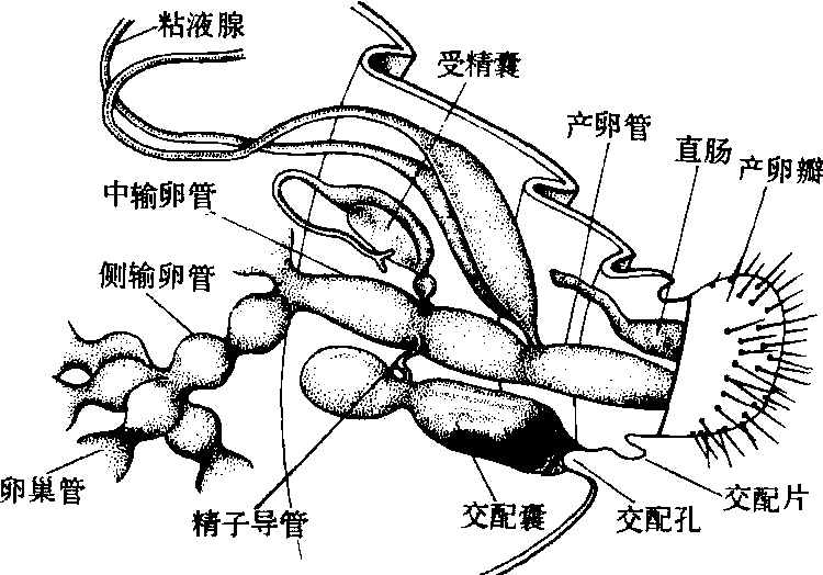 图6 柞蚕雄蛾内生殖器 雌蛾的内生殖器官由卵巢、侧输卵管、中输卵管、产卵管、受精囊、粘液腺和交配囊组成。卵巢一对,十分发达。蚕蛾羽化时卵已形成,每个卵巢有4根卵巢管,末端由端丝连接。卵巢内的各卵巢管交替排卵。侧输卵管为连接在卵巢管基部的一对短管,蚕蛾产卵时卵经侧输卵管到中输卵管。中输卵管为一短粗管道,前接侧输卵管,后与产卵管相贯连,产卵管末端的开口即位于产卵瓣腹面的产卵孔。受精囊为一小形囊状构造,由导管开口在中输卵管和产卵管之间背面,其基部有一管状受精囊腺,能向受精囊分泌保护精子的液体。粘液腺是一对能分泌粘液的腺体,粘液腺合成分泌的粘液呈褐色,可将产下的卵粒胶粘在物体上。交配囊是一个膨大的囊状体,位于中输卵管腹面,交配囊由硬化的导管开口在第8腹节腹面,开口处即为交配孔。交配囊基部发出一根细短的精子导管通到中输卵管后端。交配囊是蚕蛾交配时阳茎注入精子的场所。交配后精子从交配囊中经精子导管、中输卵管而进入受精囊内。当雌蛾排卵至中输卵管时,精子即由受精囊开口通过卵的精孔进入卵内,受精卵随即经产卵管由产卵孔产出(图7)。
